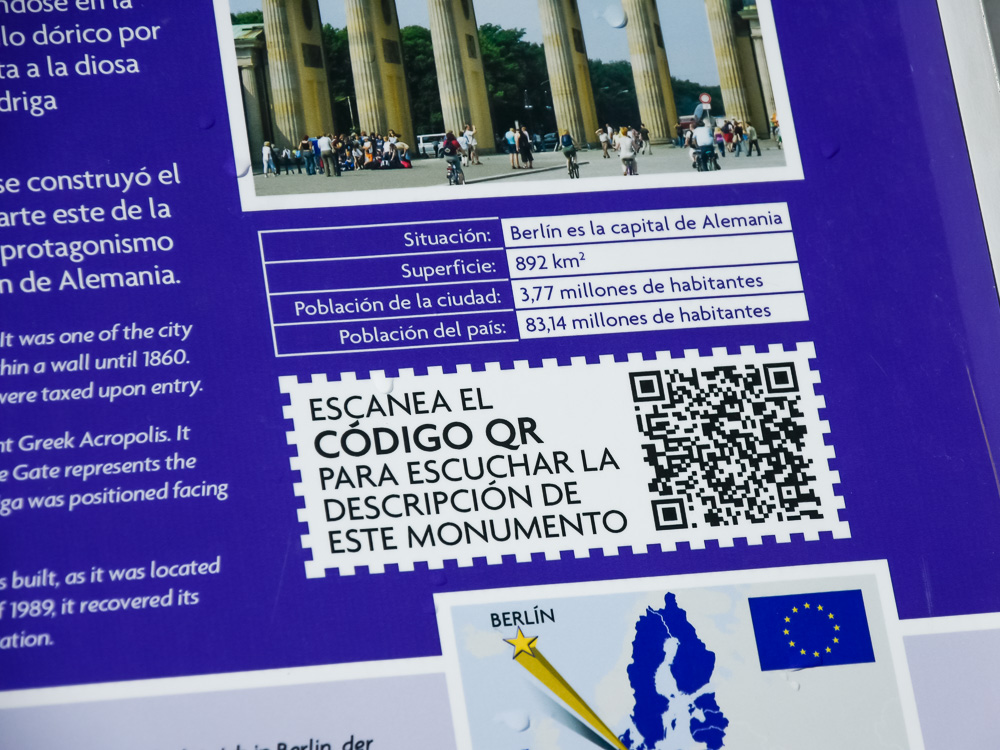A finales del mes de julio ha finalizado la renovación de todos los paneles del Parque Europa con nuevos diseños y audios descriptivos integrados Estos paneles han sido rediseñados y en ellos se ha incluido un código QR que al escanearlo podrás escuchar en tu móvil toda la información representativa del mismo. La renovación se ha desarrollado en una primera fase que ha incluido las 4 entradas al parque y otra segunda que ha incluido todos los paneles descriptivos de los monumentos y la plaza Europa.
