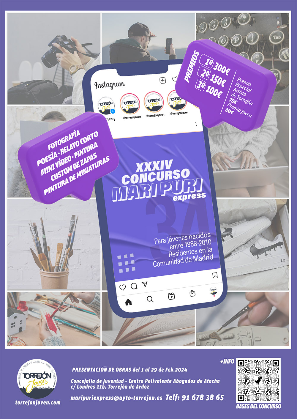 • Las obras podrán presentarse hasta el próximo 29 de febrero, en la Concejalía de Juventud, situada en el Centro Polivalente Abogados de Atocha (calle Londres 11-B). Más información en el teléfono: 91 678 38 65 y a través del correo maripuriexpress@ayto-torrejon.es