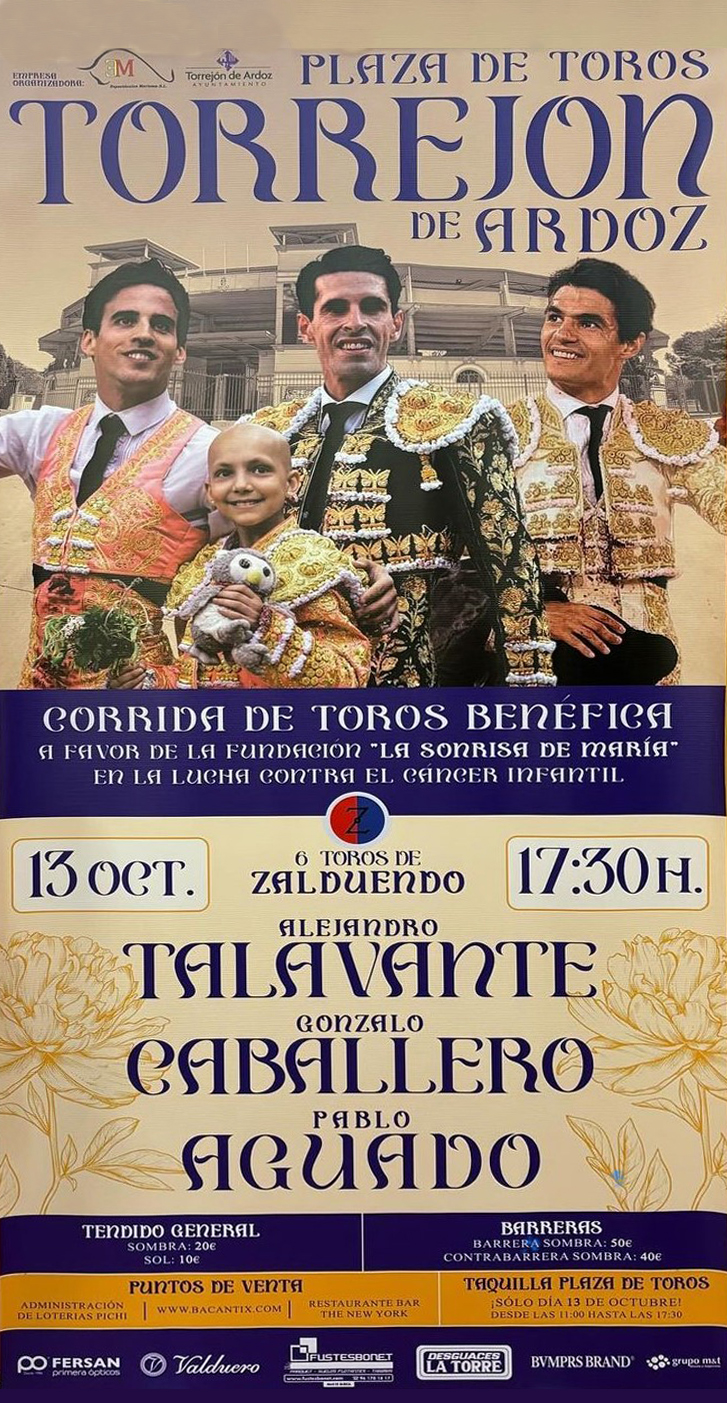 Coincidiendo con el inicio de las Fiestas Patronales, hoy de 18:00 a 23:00 horas, en la Plaza Mayor de Torrejón de Ardoz, habrá un stand situado junto al acceso principal de la Iglesia San Juan Evangelista, en el que se pondrán comprar entradas del evento taurino solidario para la lucha contra el cáncer infantil. Este festejo se celebrará el domingo 13 de octubre a las 17:30 horas en la Plaza de Toros de Torrejón de Ardoz, y contará con las figuras del toreo: Alejando Talavante, el torrejonero Gonzalo Caballero y Pablo Aguado.
