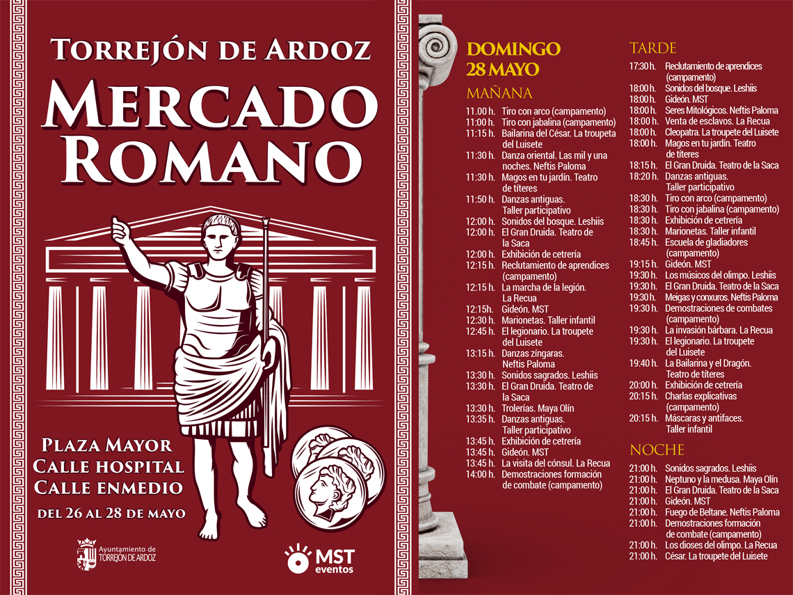 Hoy domingo, 28 de mayo, último día para disfrutar del Mercado Romano que acoge la Zona Centro de Torrejón de Ardoz. La Plaza Mayor del municipio y las calles Hospital y Enmedio se han convertido en un auténtico escenario de la antigua Roma, donde hay cientos de puestos que venden productos artesanos y alimentos y atracciones inspiradas en esta época histórica, como combates de gladiadores o exhibiciones de cetrería. Además, se desarrollan múltiples actividades para todas las edades que, junto con el teatro, los espectáculos de danza o la animación musical, completan el variado y atractivo programa de este mercado que ha transportado el centro de la ciudad a la antigua Roma.
