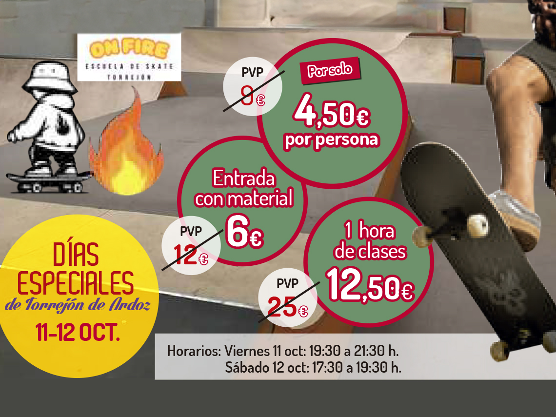• Los Días Especiales de Torrejón de Ardoz continúan hoy viernes 11 y mañana sábado 12 de octubre en la Escuela de Skate Torrejón, On Fire, donde los torrejoneros podrán acudir por sólo 4,50 euros por persona o 6 euros con material incluido (frente a los 9 y 12 euros para el resto del público)
