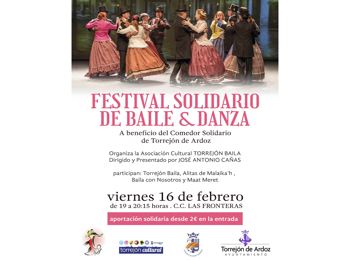 Hoy viernes, 16 de febrero, Festival Solidario de Danza y Baile en el Centro Cultural las Fronteras, organizado por la Asociación Cultural Torrejón Baila a favor del Comedor Solidario de la ciudad