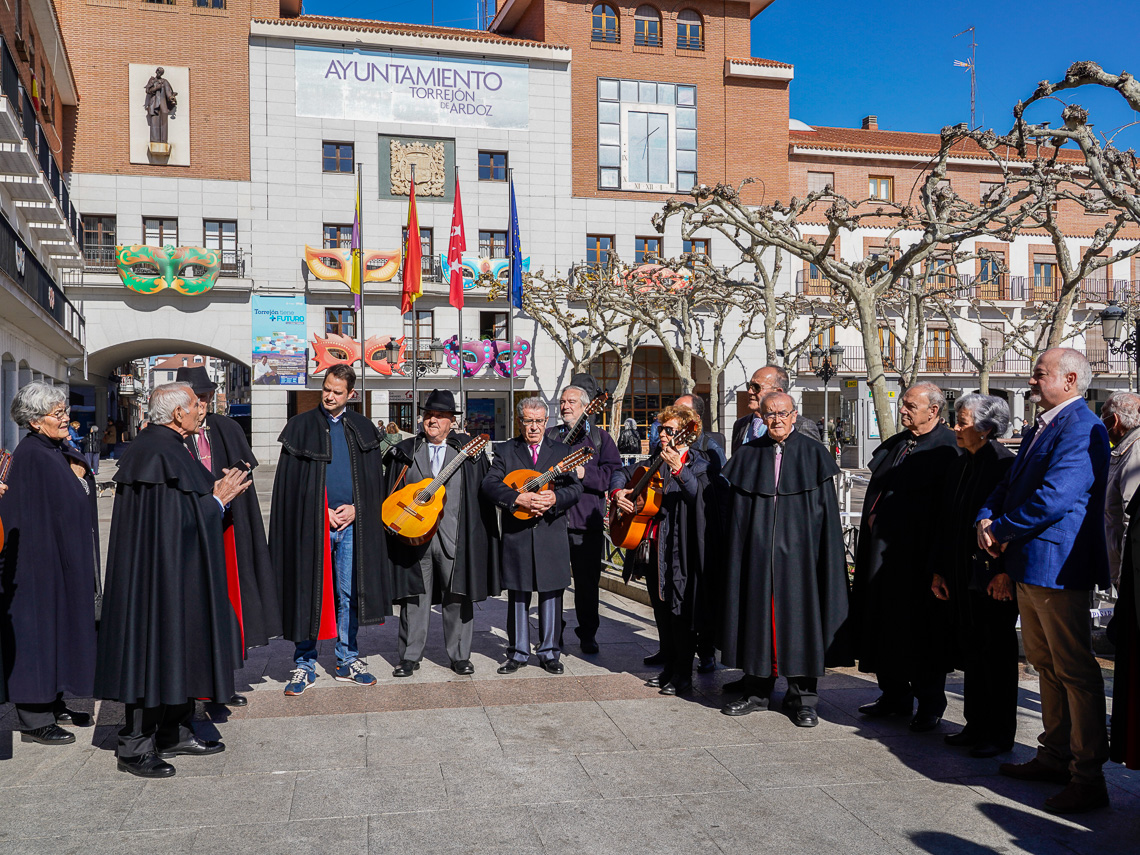 Torrejón de Ardoz, 20 de febrero de 2023. Después de recorrer la Plaza de España, la calle Enmedio y la Plaza Mayor, donde fueron recibidos por el regidor torrejonero, Ignacio Vázquez, continuaron por la calle Hospital y por la avenida Virgen de Loreto para finalizar su ronda en la Sala Municipal de Exposiciones de la Casa de la Cultura, donde cantaron acompañados por la voz del edil José Antonio Moreno y realizaron un brindis.