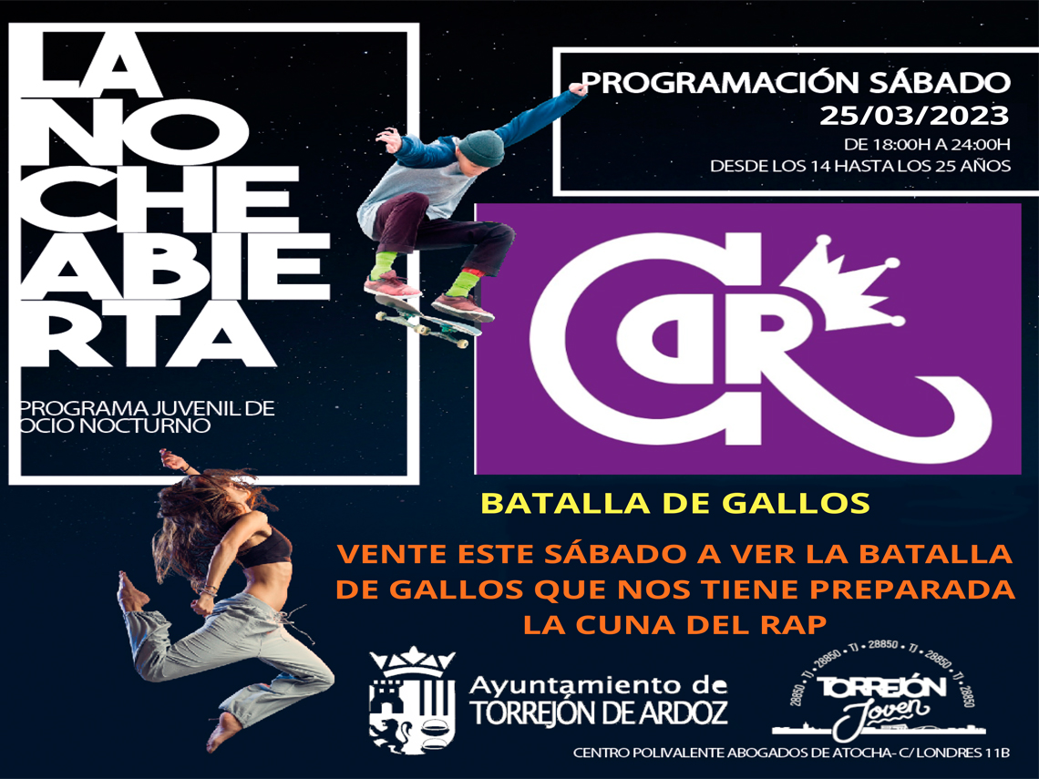 La batalla de gallos de la Cuna del Rap protagonizará “La Noche Abierta” de mañana sábado, 25 de marzo. La cita tendrá lugar a partir de las 18:00 horas en el Centro Polivalente Abogados de Atocha. Además, se podrá disfrutar del resto de actividades que hay de forma habitual, como los juegos de mesa, en colaboración con la Asociación Juvenil Místicos de Arkat, partidas de PS4, futbolín o ping-pong. La entrada es gratuita hasta completar aforo.