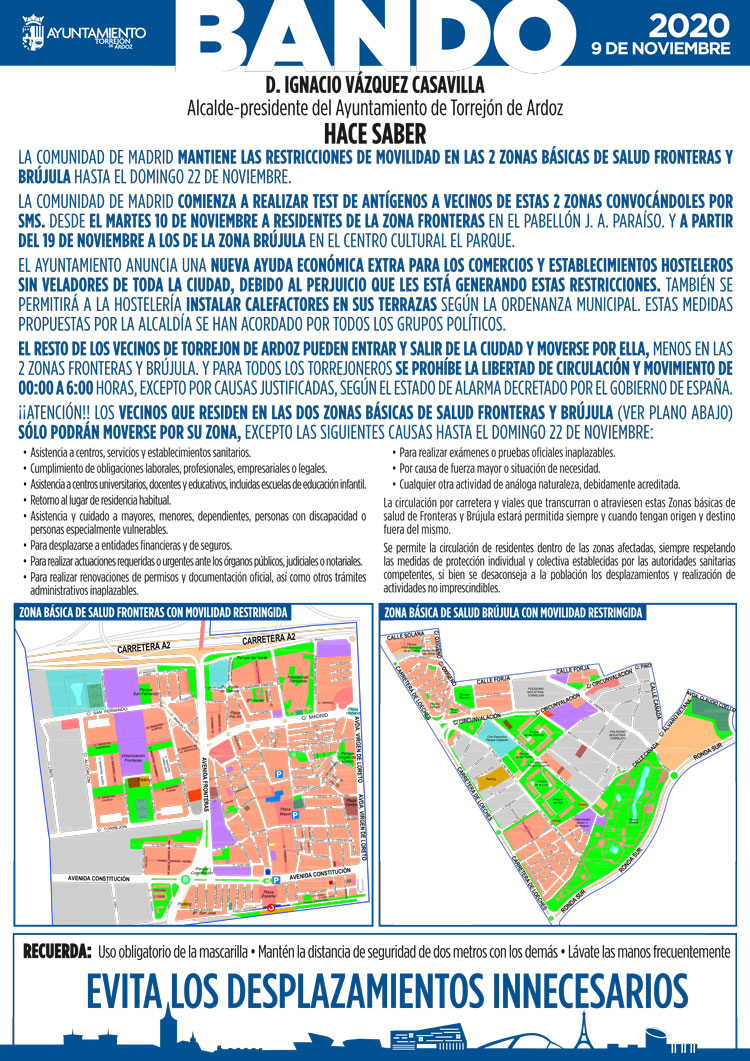 La Comunidad de Madrid mantendrá hasta el domingo 22 de noviembre las restricciones de movilidad en las Zonas Básicas de Salud de Fronteras y Brújula. Además, la Comunidad de Madrid va a comenzar a realizar test de antígenos a vecinos de estas dos zonas convocándoles por SMS.