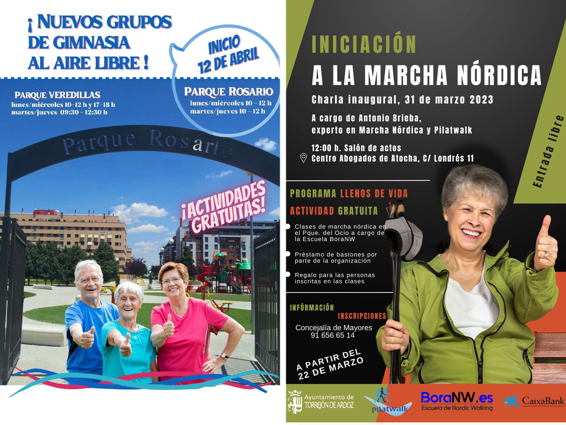• Por otra parte, los mayores de Torrejón también podrán apuntarse a las clases de “Marcha Nórdica”, una actividad gratuita que se enmarca dentro del programa “Llenos de vida”. Tendrán lugar en el Parque de Ocio y serán impartidas por la Escuela BoraNW