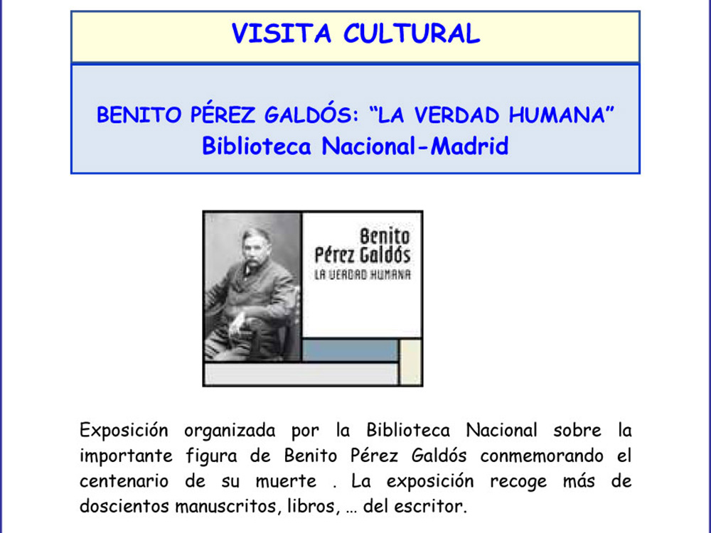 • Así, el próximo 14 de febrero tendrá lugar la visita a esta exposición organizada por la Biblioteca Nacional sobre la importante figura de Benito Pérez Galdós, conmemorando el centenario de su muerte. La muestra recoge más de doscientos manuscritos y libros del escritor