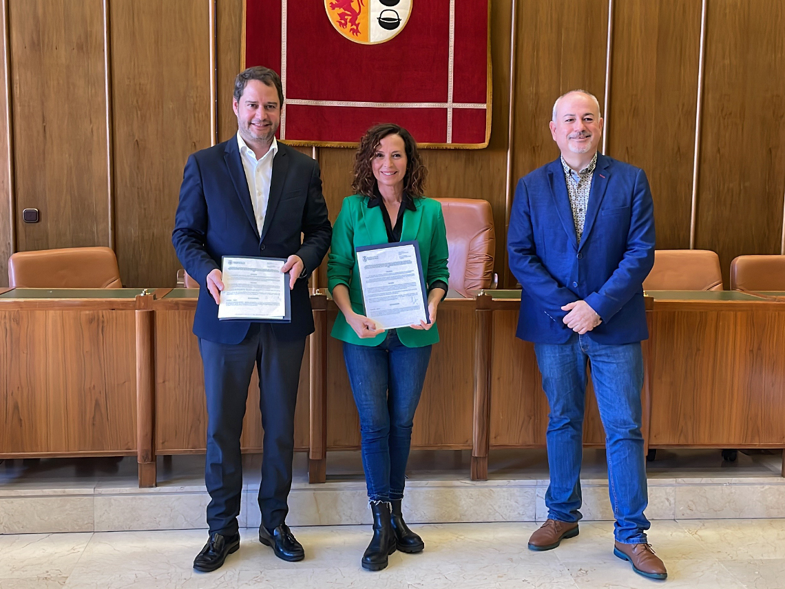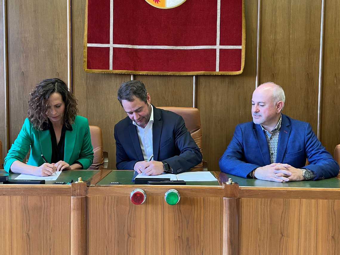 Torrejón de Ardoz, 14 de marzo 2023. Mediante el convenio firmado por la directora de la compañía, Aída Gómez, y el alcalde de Torrejón de Ardoz, Ignacio Vázquez, el Ayuntamiento cede gratuitamente una de las aulas de danza de La Caja del Arte para el desarrollo de ensayos y preproducción de los espectáculos de la compañía. Al acto también ha asistido el concejal de Cultura, José Antonio Moreno.