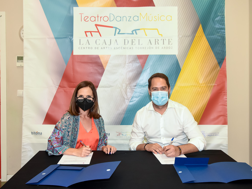 Torrejón de Ardoz, 15 de junio de 2021. Mediante el convenio firmado esta mañana entre la directora de la compañía, Aída Gómez, y el alcalde de Torrejón de Ardoz, Ignacio Vázquez, el Ayuntamiento cederá gratuitamente una de las aulas de danza de La Caja del Arte para el desarrollo de ensayos y preproducción de los espectáculos de la compañía.