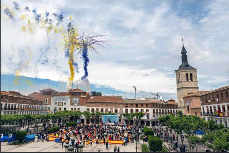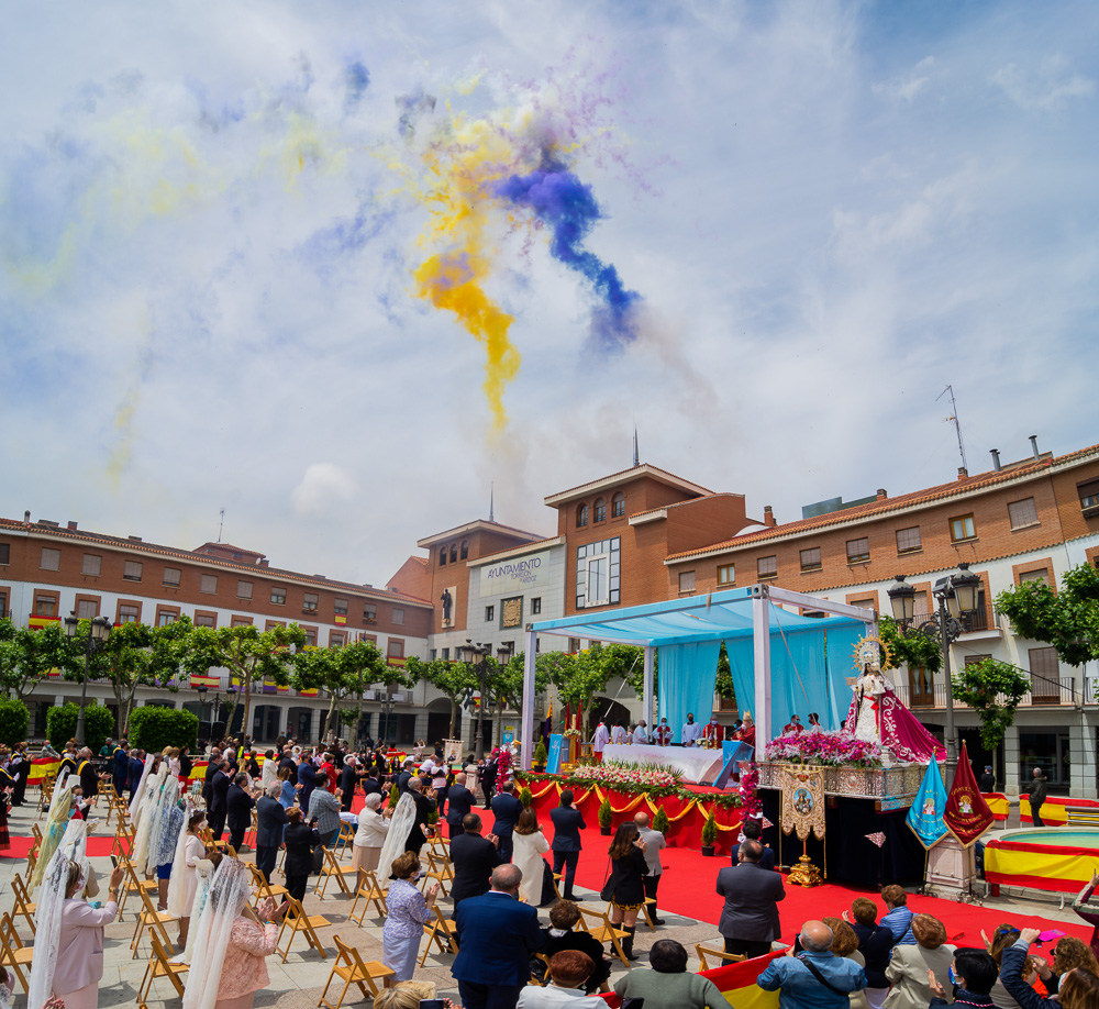 • Como colofón a las celebraciones de este fin de semana, ayer domingo 23 de mayo, se celebró en la Plaza Mayor de Torrejón la Misa Mayor conmemorativa del 300 Aniversario de la Hermandad y del XI Aniversario de la Coronación Canónica de la Virgen del Rosario, respetándose las limitaciones establecidas por las autoridades sanitarias. La ceremonia fue oficiada por el Obispo de Alcalá de Henares, Juan Antonio Reig Plá, acompañado de sacerdotes de la Iglesia San Juan Evangelista y otras parroquias de la ciudad, con numerosos componentes de la Hermandad vestidos de goyescos o ataviadas con mantilla blanca y peineta, portando la medalla de miembro de la misma. El broche de oro fue un ramillete aéreo de fuegos artificiales con los colores de la bandera de Torrejón de Ardoz