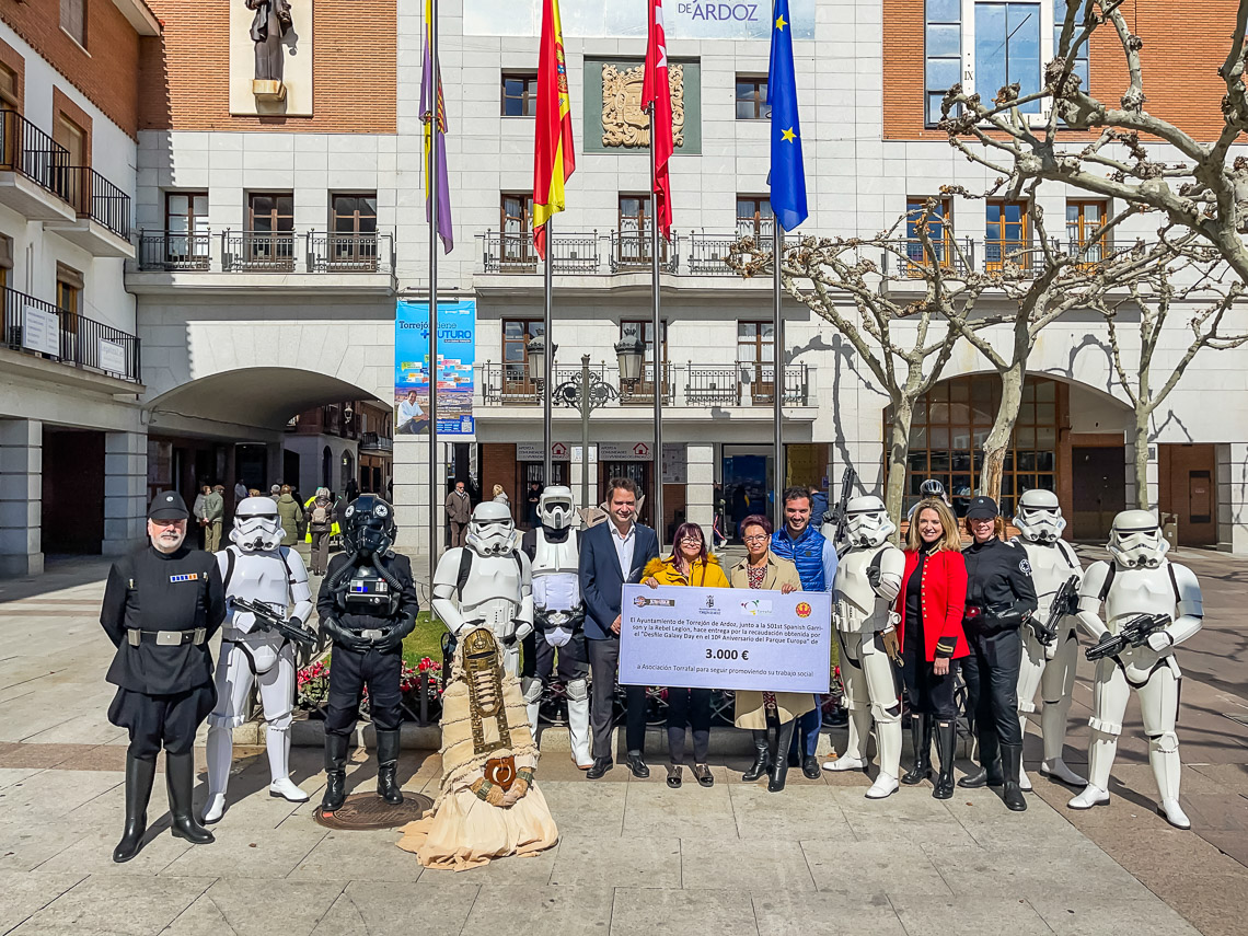 • Representantes de la Legión 501 Spanish Garrison y la Rebel Legion de la Guerra de las Galaxias, acompañados por el alcalde, Ignacio Vázquez, el concejal de Festejos y Juventud, Alejandro Navarro Prieto, y la edil de Mayores Ana Verónica González, han entregado esta mañana en la Plaza Mayor dos cheques por importe de 3.000 euros a la Asociación de Parkinson y la Asociación de familiares de enfermos de Alzheimer (Torrafal) procedentes de la recaudación obtenida del desfile Star Wars Galaxy Day con motivo del décimo aniversario del Parque Europa que se celebró en el pasado mes de septiembre