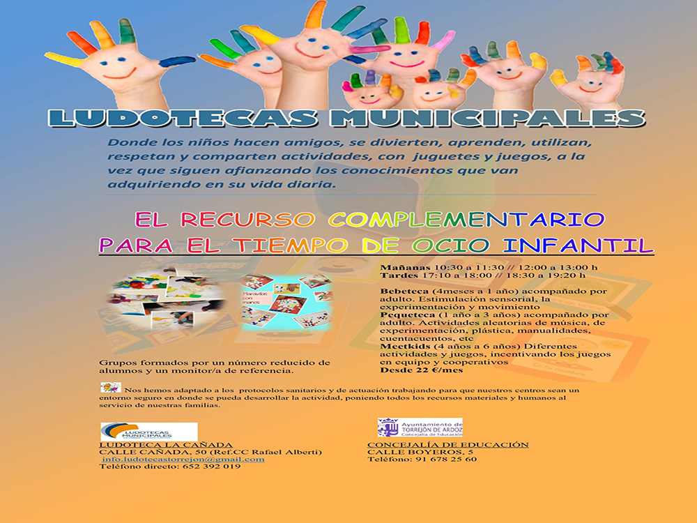 Dadas las excepcionales circunstancias por el actual contexto de emergencia sanitaria, cuentan con aforo reducido de participantes, con adicionales medidas sanitarias y de higiene frente a la COVID-19. Existen aún plazas disponibles en todos los grupos. Para más información e inscripciones en la Ludoteca Municipal La Cañada (Centro Cultural Rafael Alberti, calle Cañada 50), así como en el teléfono 652.392.019 y en el correo electrónico info.ludotecastorrejon@gmail.com. También, en la sede de la Concejalía de Educación, en la calle Boyeros 5, teléfono 91 678 25 60.