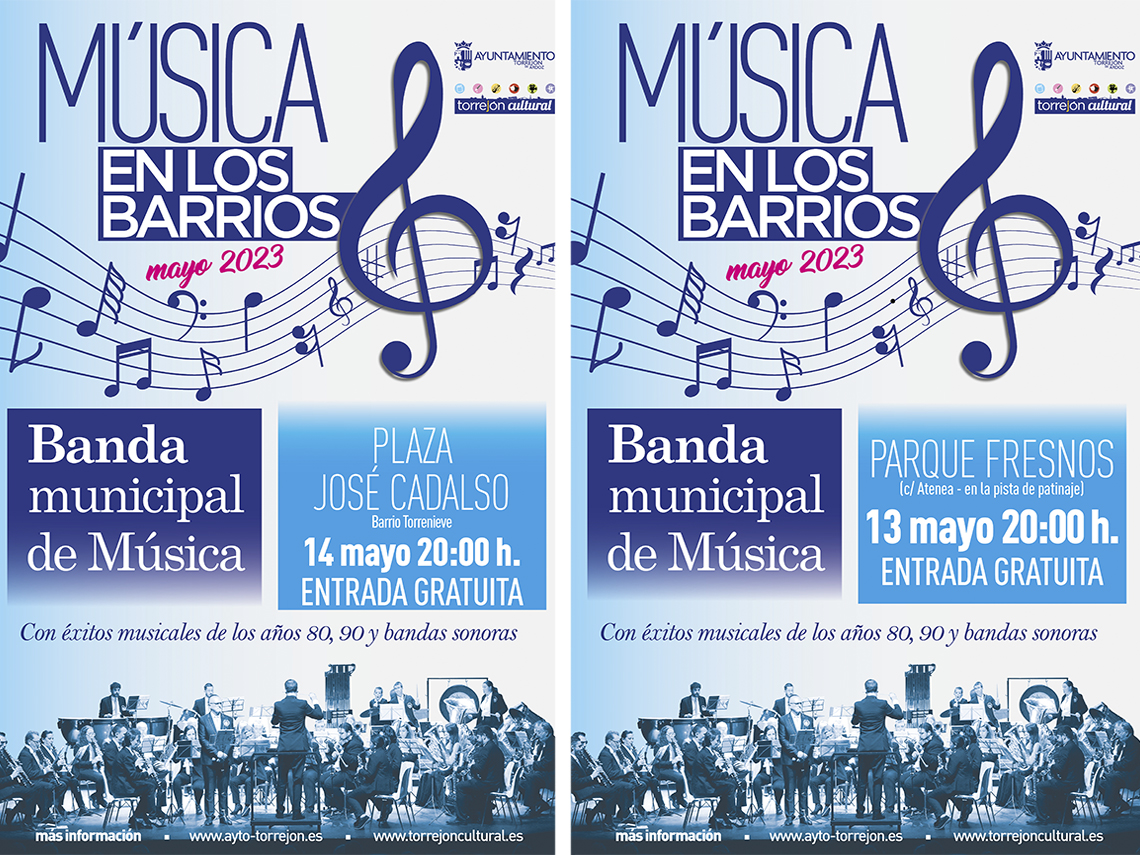 Después del gran éxito de la pasada edición de “Música en los barrios”, el Ayuntamiento de Torrejón de Ardoz, a través de su Concejalía de Cultura, ha vuelto a poner en marcha esta iniciativa gratuita para los vecinos en la que la Banda municipal de Música actua en diferentes zonas de la ciudad. Así, mañana sábado, 13 de mayo, tocarán en el Parque Fresnos (calle Atenea, en la pista de patinaje) y el domingo, 14 de mayo, en la Plaza José Cadalso (Barrio Torrenieve). Las citas tendrán lugar a partir de las 20:00 horas y la agrupación musical torrejonera interpretará éxitos de los años 80 y 90, además de las bandas sonoras más famosas del cine.