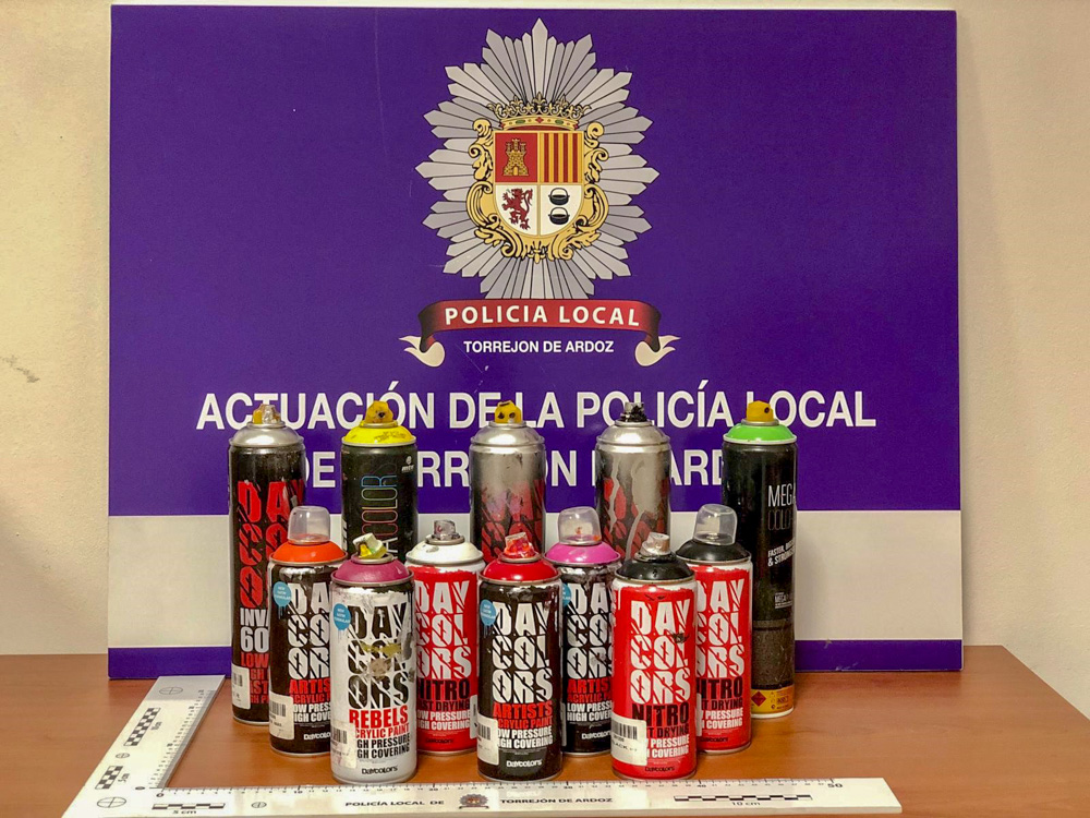 La Policía Local de Torrejón intercepta en los últimos meses a varias personas por realizar pintadas vandálicas y se incauta de diferentes botes de sprays utilizados para ensuciar la ciudad