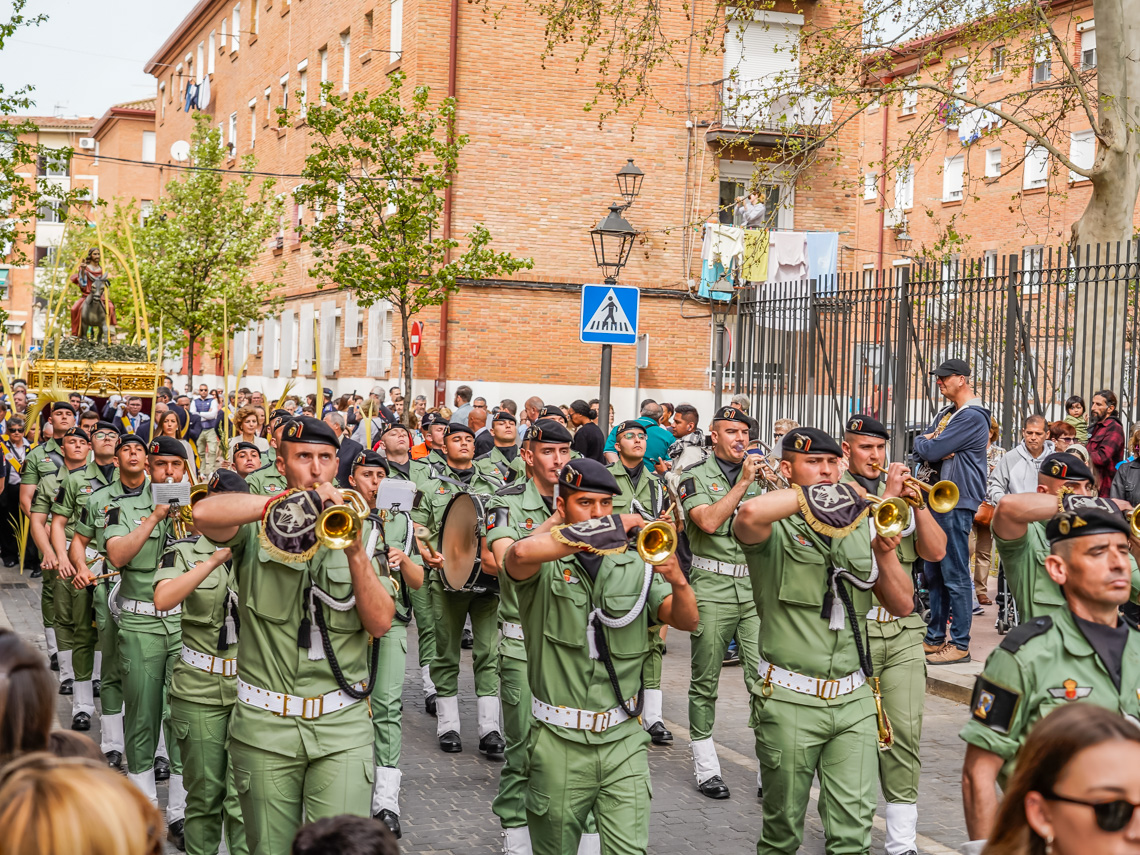Torrejón de Ardoz, 1 de abril de 2024. En el año 2014 el Consejo de Gobierno de la Comunidad de Madrid aprobó la Declaración de la Semana Santa torrejonera como Fiesta de Interés Turístico Regional. La Procesión del Domingo de Ramos de la Hermandad Ntra. Sra. Virgen del Rosario Coronada fue una de las procesiones que se pudo celebrar con normalidad acompañada por el Pasacalles de la Brigada Paracaidista (BRIPAC) y los Hermanos Mayores de la Hermandad.