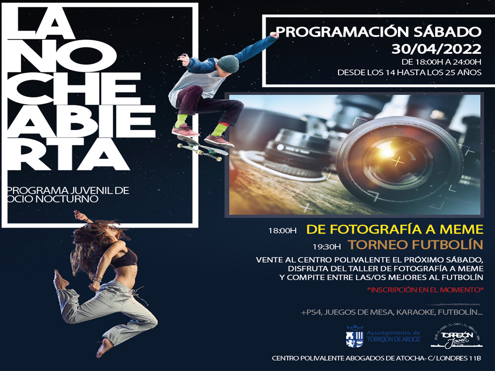 Las actividades especiales del programa de ocio alternativo para jóvenes “La Noche Abierta” continúan este sábado 30 de abril con un taller de fotografía y un torneo de futbolín