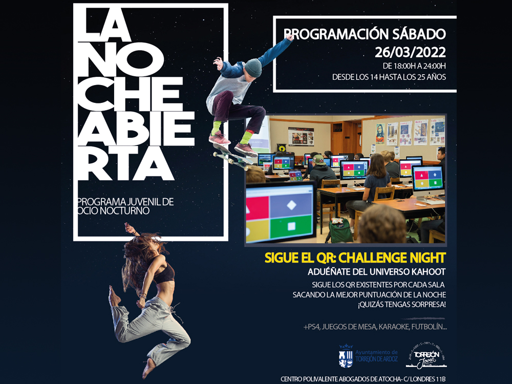 • “La Noche Abierta” es un programa con alternativas de ocio nocturno saludable para jóvenes de 14 a 25 años con actividades especiales que se adaptan a todos los gustos. Para este sábado 26 de marzo se ha programado “Sigue el QR: Challenge Night, aduéñate del universo Kahoot”