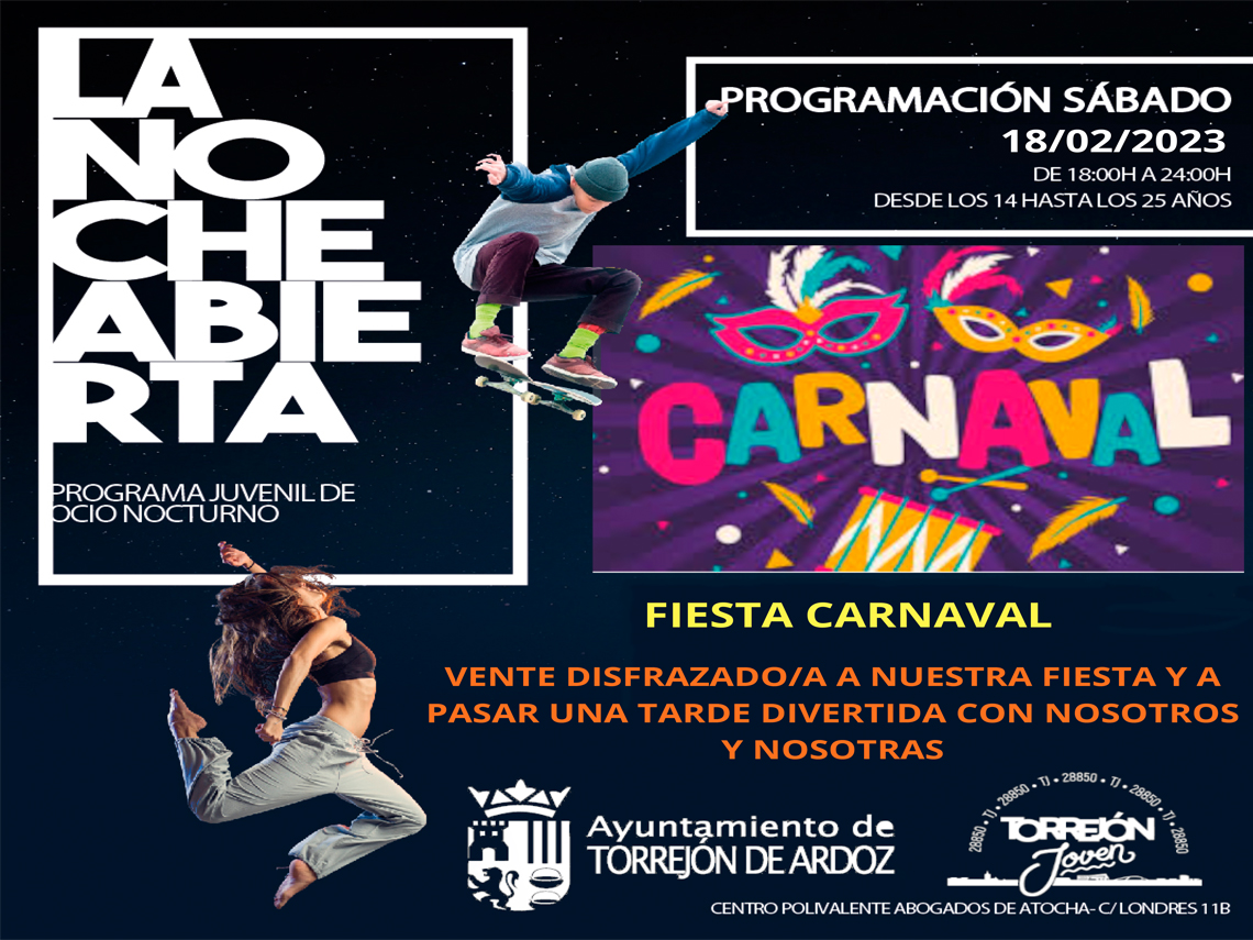 Los Carnavales protagonizan la iniciativa gratuita de ocio alternativo para jóvenes, “La Noche Abierta”, de mañana sábado, 18 de febrero, con una gran fiesta en la que podrás ir disfrazado. La cita tendrá lugar a partir de las 18:00 horas en el Centro Polivalente Abogados de Atocha. Además, se podrá disfrutar del resto de actividades que hay de forma habitual, como los juegos de mesa, en colaboración con la Asociación Juvenil Místicos de Arkat, partidas de PS4, futbolín o ping-pong. La entrada es gratuita hasta completar aforo.