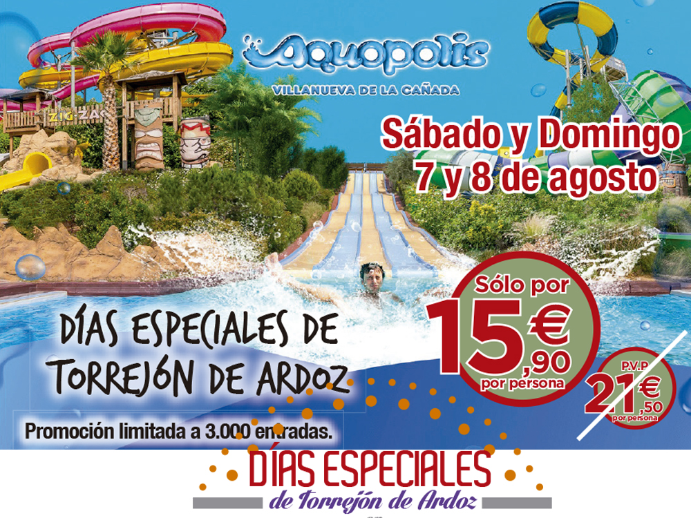 Los Días Especiales de Torrejón de Ardoz de este verano terminan este fin de semana con un descuento en la entrada al Aquopolis de Villanueva de la Cañada para los torrejoneros. De esta forma, el sábado 7 y el domingo 8 la entrada valdrá 15,90 euros por persona en vez de los 21,50 que vale sin descuento. En este caso, la promoción está limitada a 3.000 entradas. La oferta será válida para un titular y tres acompañantes, mostrando la documentación que acredite la residencia en Torrejón de Ardoz del titular.