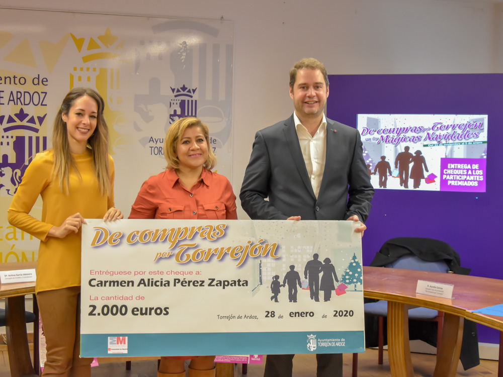 El alcalde, Ignacio Vázquez, y la concejala de Empleo y Contratación, Ainhoa García, han entregado esta mañana los premios correspondientes a la duodécima edición del concurso “De compras por Torrejón en las Mágicas Navidades”, en el que participaban los clientes que realizaran una compra superior a los 20 euros en los comercios adheridos a la campaña. Así, la ganadora del cheque-compra por valor de 2.000 euros ha sido Carmen Alicia Pérez, mientras que el premio del cheque-compra por valor de 1.200 euros ha recaído en Rubí Gutiérrez. Además, el ganador del cheque-compra por valor de 800 euros ha sido Francisco Hernández y del lote de productos, Aurelio Correa. Estos premios tendrán que canjearse en compras no superiores a 300 euros en cualquiera de los locales participantes. De esta forma, el Ayuntamiento de Torrejón ha vuelto a poner en marcha un año más esta campaña con el objetivo de dinamizar el pequeño y mediano comercio de la ciudad.