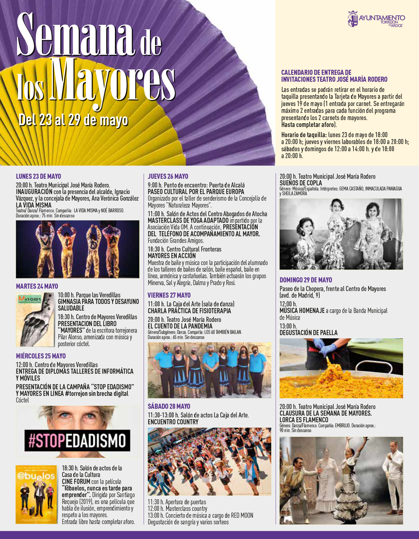 Torrejón de Ardoz, 20 de mayo de 2021. La Semana de los Mayores vuelve con importantes novedades como un encuentro Country, degustación de paella, la campaña Stop Edadismo y mayores en línea, cine, espectáculos en el teatro o la presentación del Teléfono de Acompañamiento al Mayor, entre otras iniciativas. Todas las actividades son gratuitas.