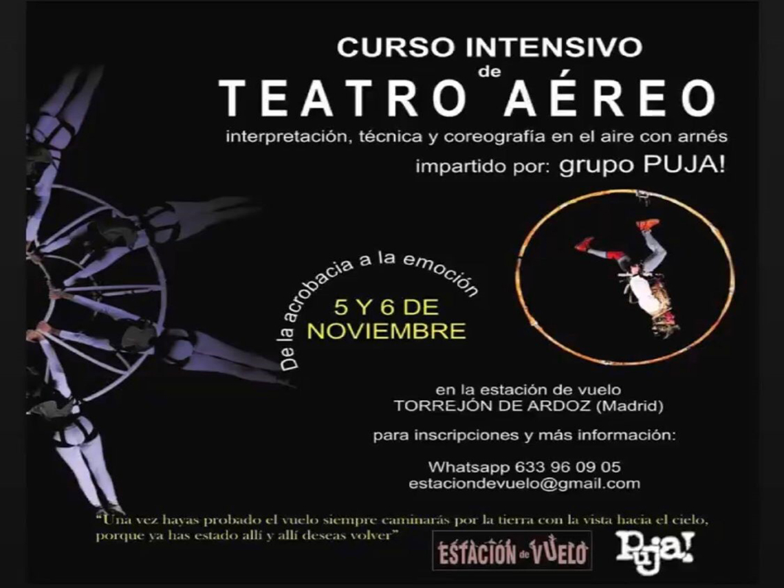 Los próximos 5 y 6 de noviembre, la gran compañía internacional de teatro aéreo Grupo Puja! impartirá un curso intensivo de teatro aéreo, enseñando interpretación, técnica y coreografía en el aire con arnés. Para inscripciones y más información se puede mandar un correo electrónico a estaciondevuelo@gmail.com o mandar un whatsapp al número 633 96 09 05.