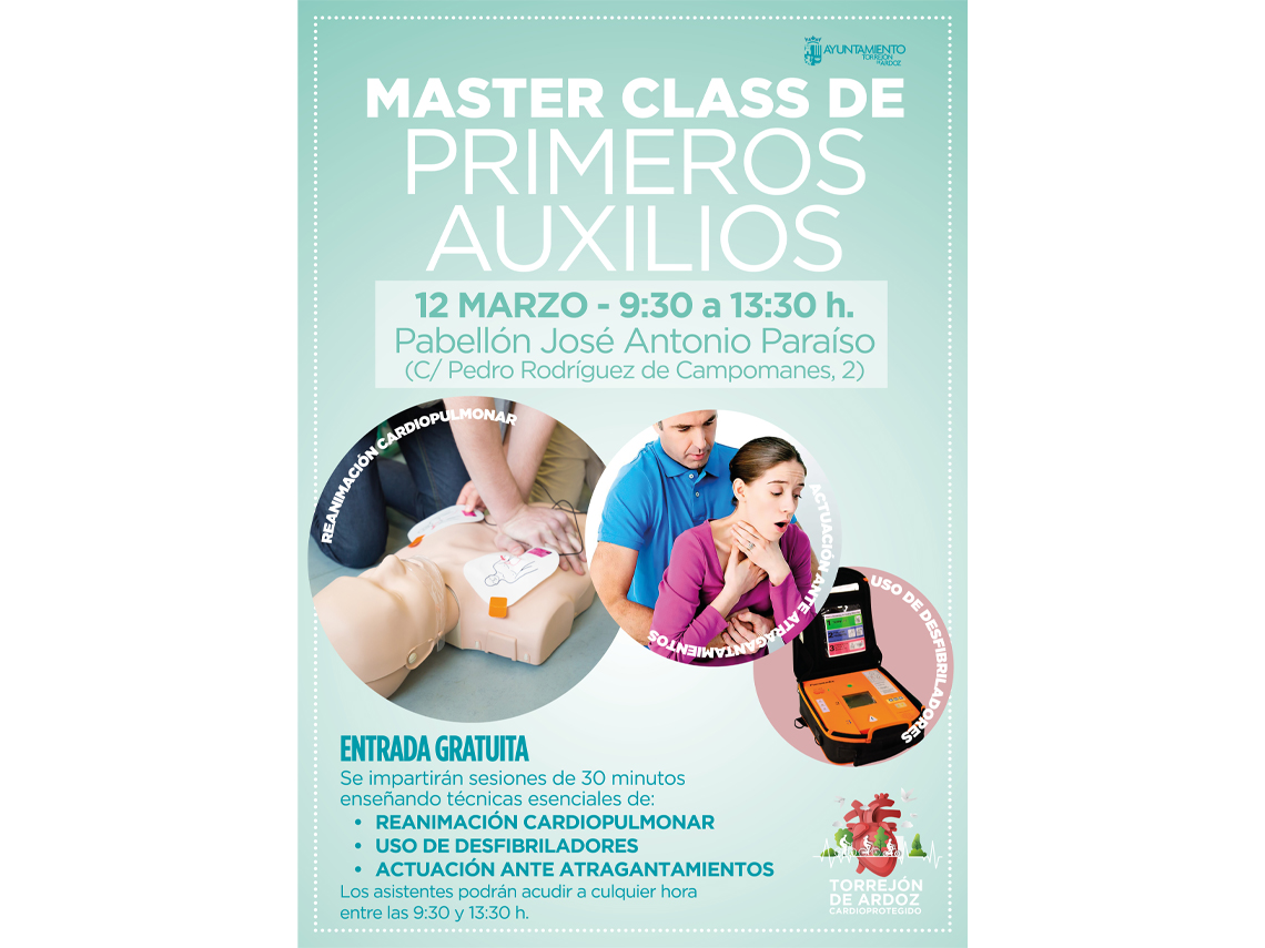 • El Ayuntamiento de Torrejón de Ardoz celebra esta Master Class con el objetivo de enseñar técnicas esenciales de reanimación cardiopulmonar, uso de desfibriladores y actuación ante atragantamientos impartidos por personal sanitario cualificado. Se impartirán en sesiones de 30 minutos, pudiendo acudir a cualquier hora entre las 9:30 y las 13:30 horas