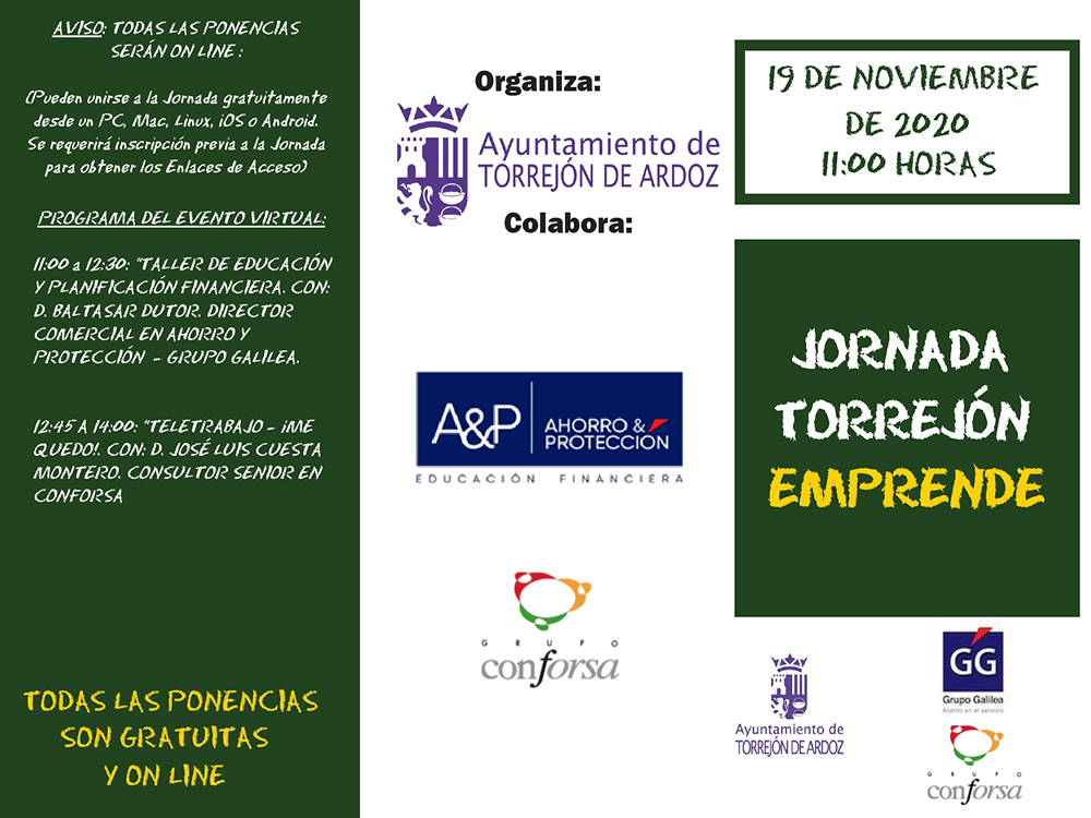 Estas actuaciones, que se enmarcan dentro del Proyecto “Torrejón Emprende”, están dirigidas a las personas que tienen una idea empresarial y desean ponerla en marcha, pero que precisan información y asistencia técnica para llevarla a cabo. En este sentido, los participantes podrán obtener información de primera mano de expertos en el “Taller de Educación y Planificación financiera”, a cargo de Baltasar Dutor, director comercial en Ahorro y Protección del Grupo Galilea. A continuación, será el turno de “Teletrabajo. ¡Me quedo!”, impartida por José Luis Cuesta Montero, consultor senior en Conforsa