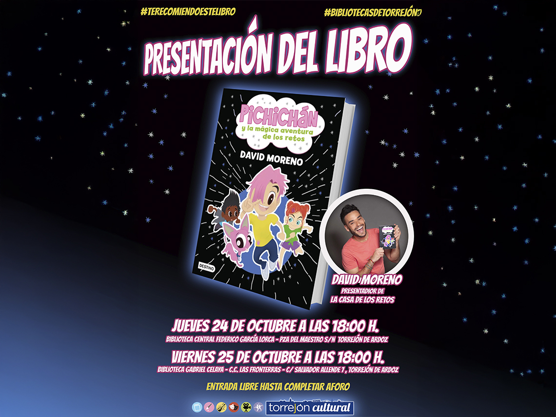 Torrejón de Ardoz acogerá la presentación del libro infantil "Pichichán y la mágica aventura de los retos", de David Moreno, el famoso presentador del concurso “La casa de los retos”, del canal infantil Boing. Las citas tendrán lugar mañana, jueves 24, en la Biblioteca Central Federico García Lorca (Plaza del Maestro s/n) y el viernes, 25 de octubre, en la Biblioteca Gabriel Celaya (Centro Cultural Las Fronteras, calle Salvador Allende, 7), a las 18:00 horas con entrada libre hasta completar aforo.