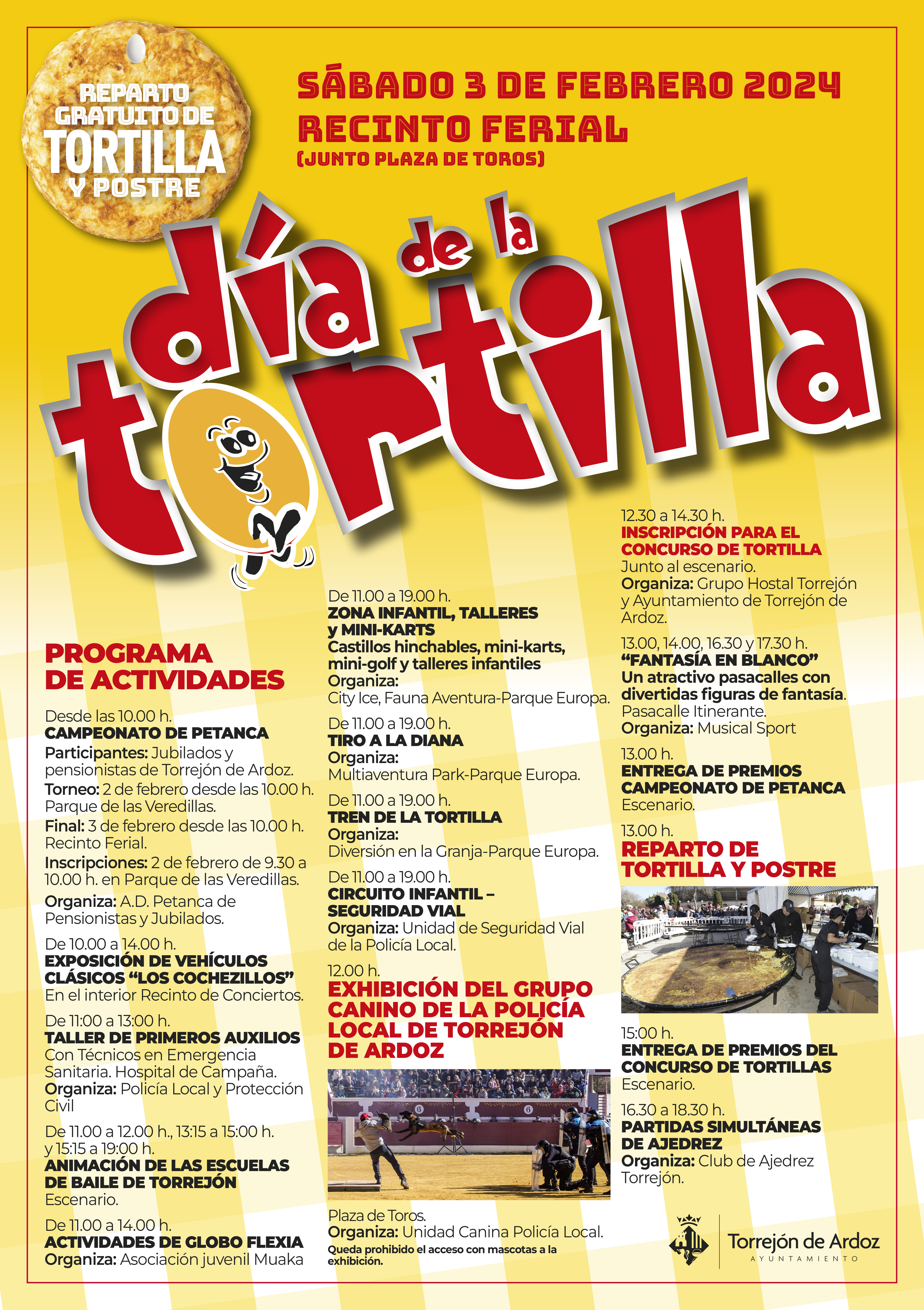 Masiva participación de torrejoneros en el Día de la Tortilla, batiendo récords en una jornada espléndida en la que destacó el reparto gratuito, la espectacular exhibición canina o el concurso de tortilla, entre otras actividades. Decenas de miles de personas participaron en el reparto gratuito de tortilla y postre ya tradicional en este día. Otra de las iniciativas que resultó un gran éxito fue la espectacular Exhibición del Grupo Canino de la Policía Local celebrada en la Plaza de Toros que tuvo otro lleno histórico y que hizo las delicias de los asistentes con una emociónate y aplaudida demostración llevada a cabo por los agentes y sus perros que sorprendieron por la originalidad y calidad de las pruebas y que contó con la participación de otras policías invitadas de la Comunidad de Madrid.