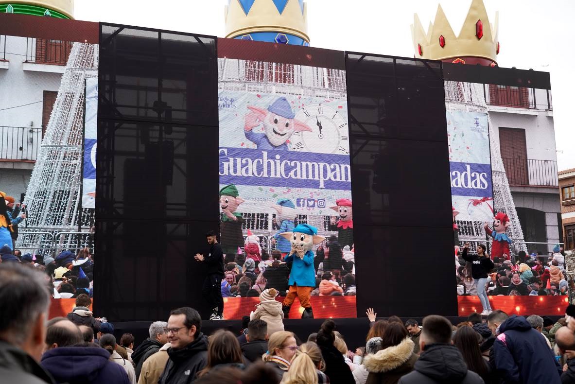 Los Guachis entrañables personajes protagonistas de las Mágicas Navidades de Torrejón hicieron bailar a una repleta Plaza Mayor y dieron la bienvenida al 2024 con las Pre-Uvas al son de las Guachicampanadas y con toda su alegría y música.