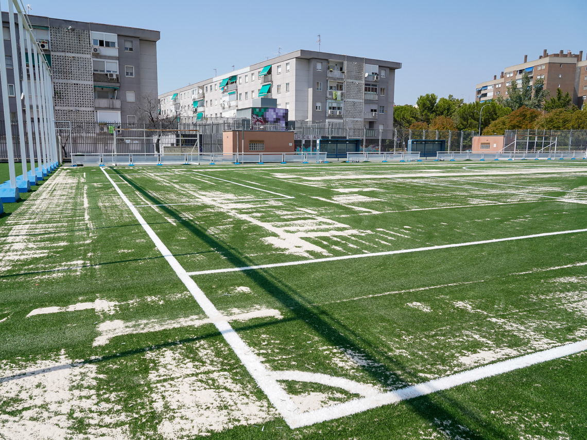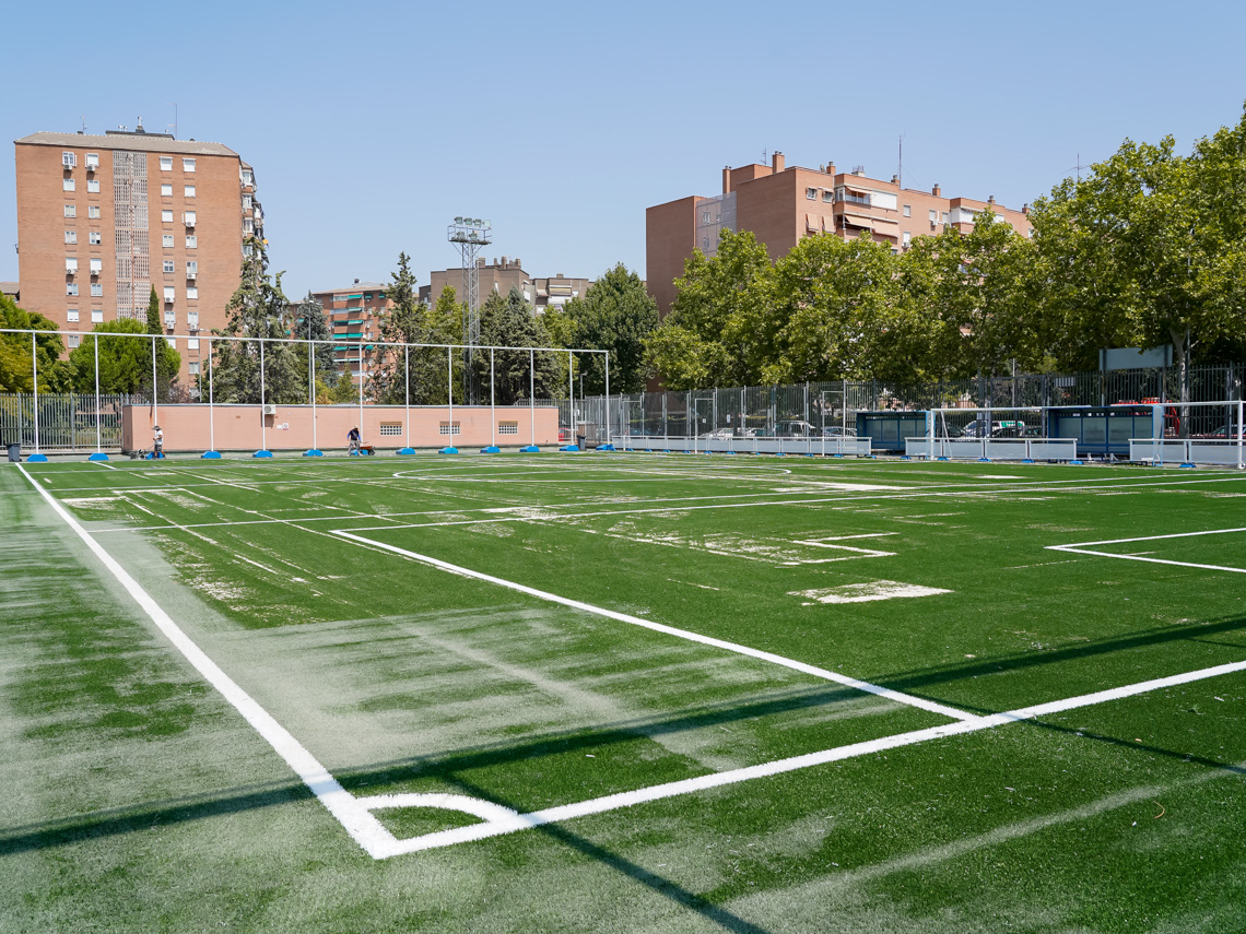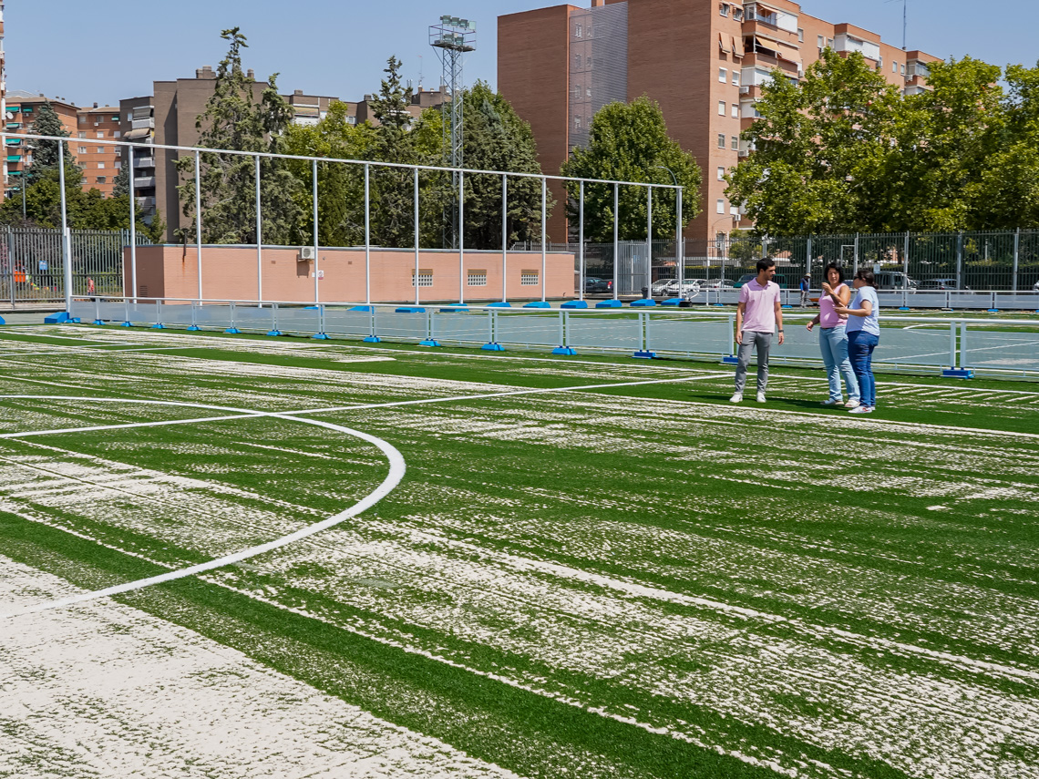 Torrejón de Ardoz, 27 de agosto de 2024. En total se están renovando 5.970 metros cuadrados de césped artificial de última generación, del tipo Combo Max, con licencia FIFA, que incluyen los dos campos y las zonas de calentamiento. Recordar que también se está renovando el césped del Campo de Fútbol Las Veredillas.