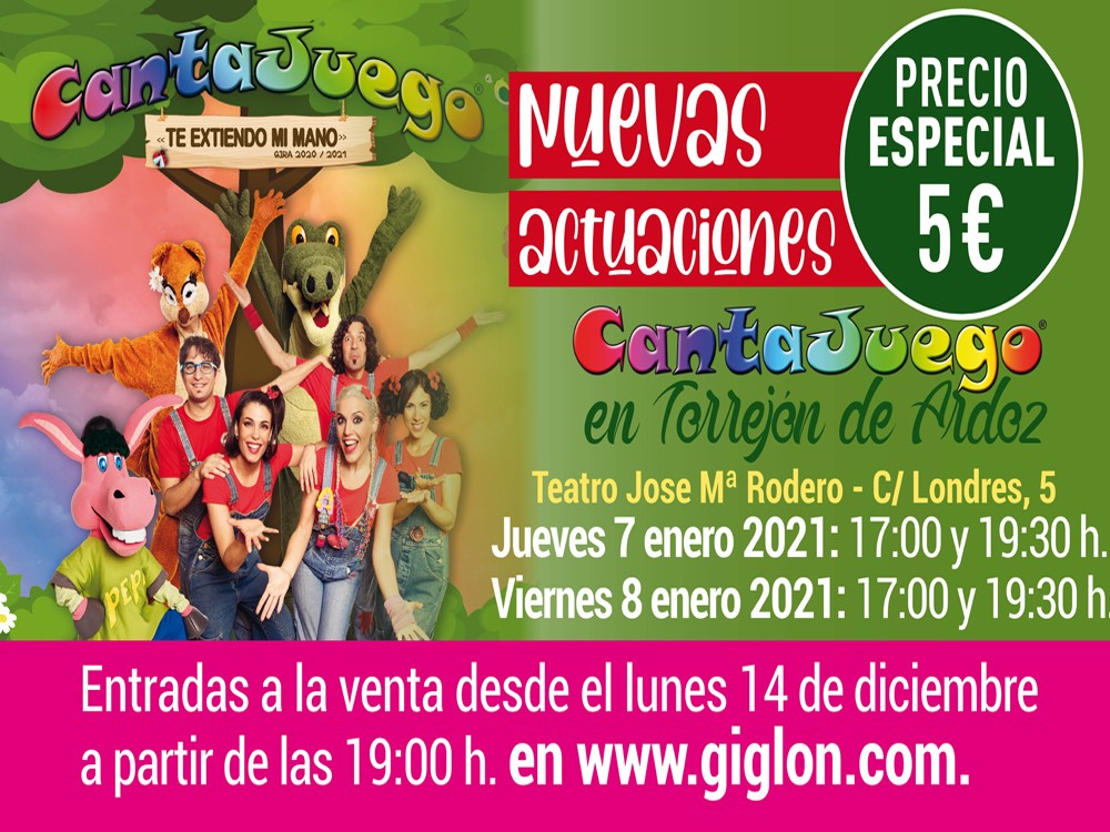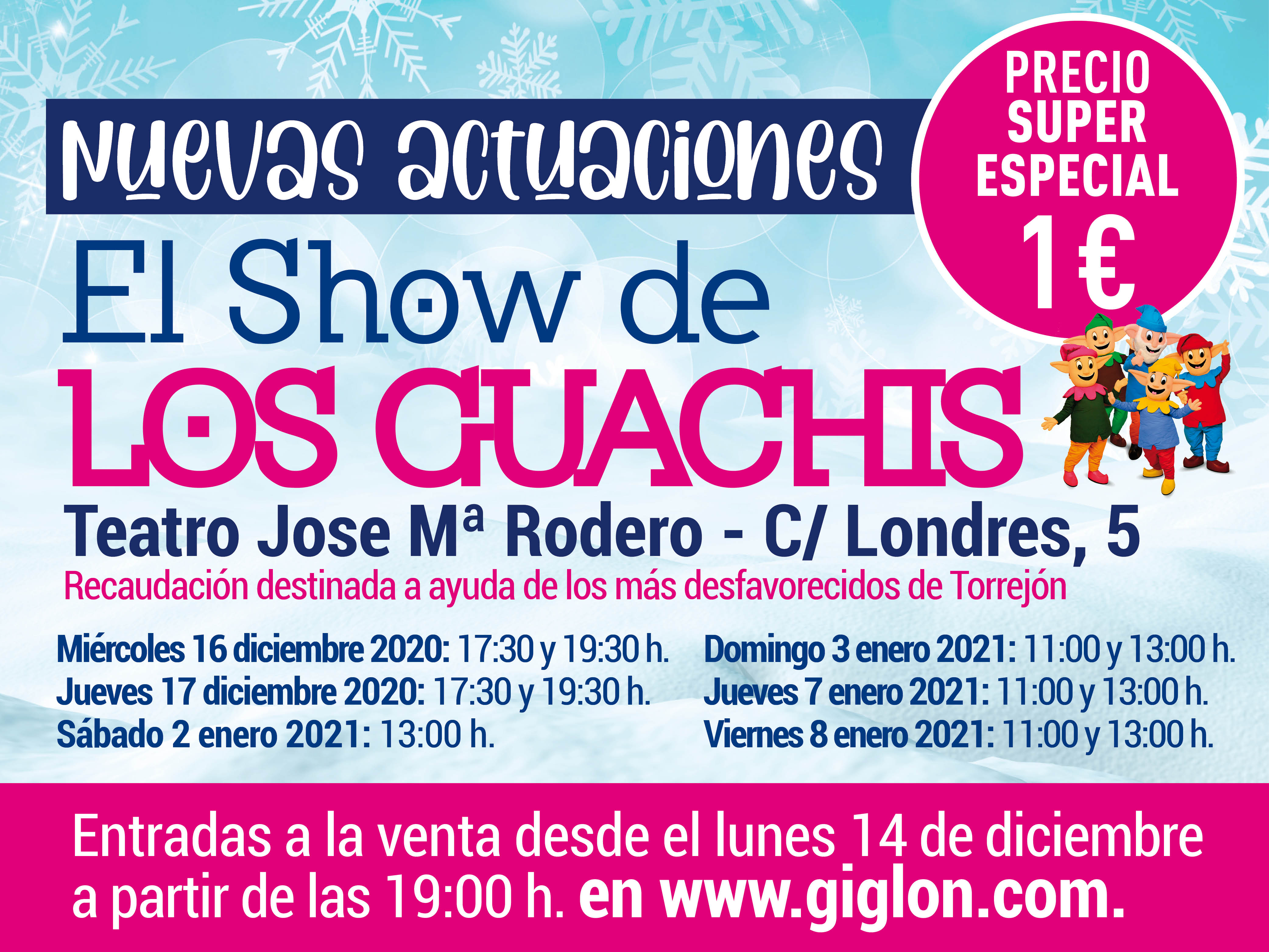 Debido a la gran acogida de los torrejoneros, el alcalde, Ignacio Vázquez, ha decidido aumentar en 11 las actuaciones del Show de los Guachis y en 4 la de CantaJuego. Estas nuevas actuaciones de los Guachis y CantaJuego serán también en el Teatro municipal José Mª Rodero. Las entradas para estos espectáculos se pondrán a la venta hoy lunes 14 de diciembre a partir de las 19:00 horas en el portal www.giglon.com.