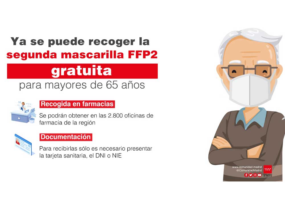 A partir de hoy viernes 19 de febrero, los torrejoneros mayores de 65 años ya pueden recoger la segunda mascarilla FFP2 que la Comunidad de Madrid entrega de forma gratuita en las farmacias de la ciudad. El pasado 4 de febrero ya comenzó el reparto de la primera de estas mascarillas que cumplen con la normativa de la Unión Europea y son reutilizables, con una duración mayor que la de las quirúrgicas, siendo las más recomendadas para afrontar la pandemia del coronavirus y frenar los contagios. Solo hay que presentar la tarjeta sanitaria de la Comunidad de Madrid, para controlar de esta forma el reparto a través de la receta electrónica.