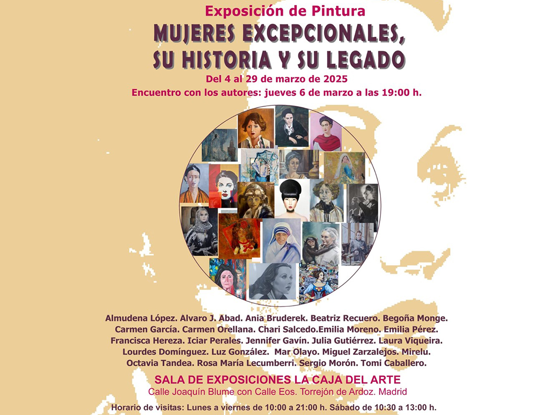 • Igualmente, en La Caja del Arte, hasta el próximo 29 de marzo estará la exposición de pintura “Mujeres excepcionales, su historia y su legado”, del Círculo de Pintores Solidarios y con la colaboración de Cruz Roja y las fundaciones Philippe Cousteau y Almatea. Se podrá ver en horario de lunes a viernes, de 10:00 a 21:00 horas y sábados de 10:30 a 13:00 horas