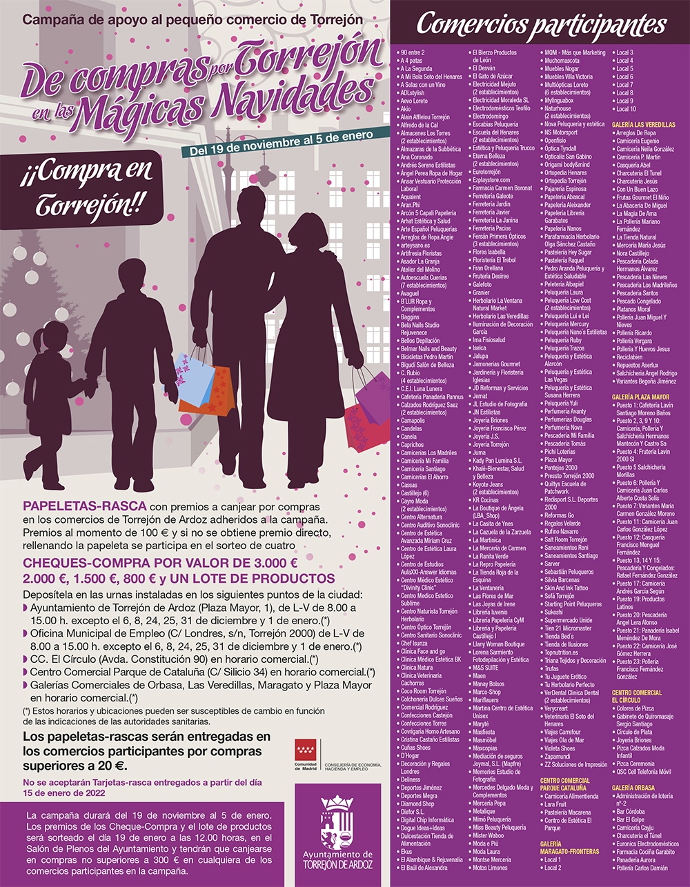Torrejón de Ardoz, 18 de noviembre de 2021. Por un lado, existen un total de 20 tarjetas-rascas con premios directos de 100 euros que el ganador podrá canjear en compras en un único comercio de los adheridos a la campaña y que deberá entregar en la Concejalía de Empleo antes del 15 de enero de 2022. Es requisito indispensable que esté debidamente cumplimentada con los datos requeridos. Por otro, todas las Tarjeta-Rasca no premiadas podrán participar en el sorteo de un cheque compra de 3.000 euros, 2.000 euros, 1.500 euros y 800 euros y de un lote de productos de los comercios.