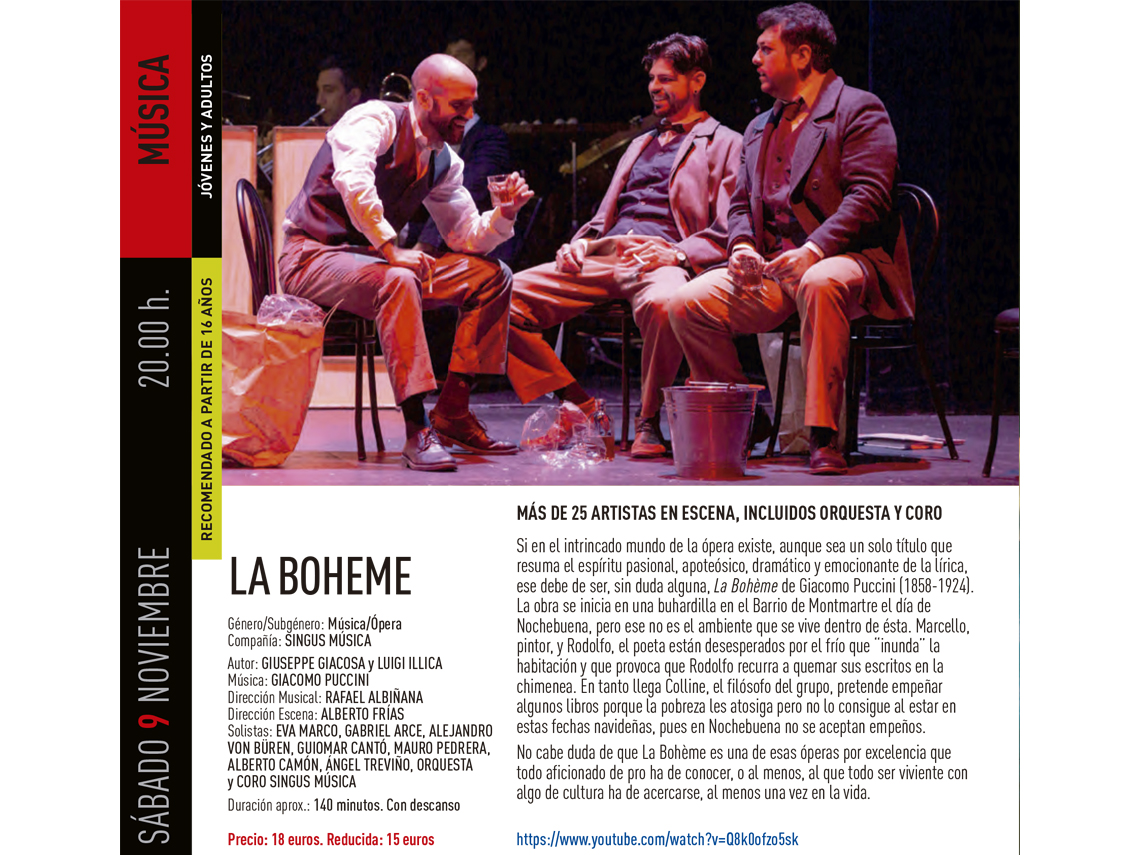 • Mañana, sábado, 9 de noviembre, también a las 20:00 horas, será el turno de “La Boheme”, de Giacomo Puccini, que con más de 25 artistas en escena es una de esas óperas por excelencia que todo aficionado de pro ha de conocer. La obra se inicia en una buhardilla en el Barrio de Montmartre el día de Nochebuena, pero ese no es el ambiente que se vive dentro de ésta. Marcello, pintor, y Rodolfo, el poeta están desesperados por el frío que “inunda” la habitación y que provoca que Rodolfo recurra a quemar sus escritos en la chimenea. En tanto llega Colline, el filósofo del grupo pretende empeñar algunos libros porque la pobreza les atosiga, pero no lo consigue al estar en estas fechas navideñas, pues en Nochebuena no se aceptan empeños