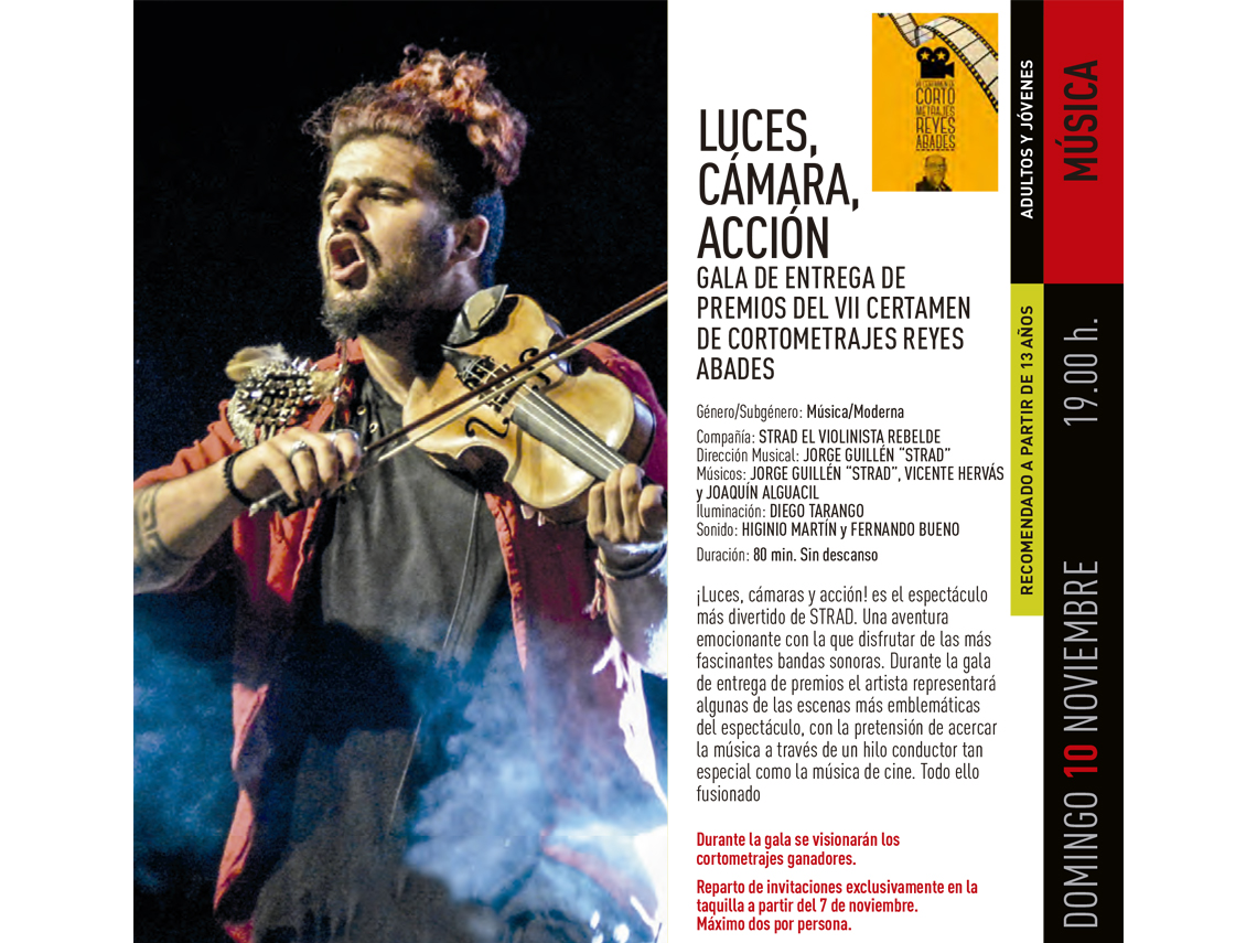 El domingo, 10 de noviembre, llega la entrega de premios del VII Certamen de Cortometrajes Reyes Abades, en el que se visionarán los cortos ganadores y contará con el divertido espectáculo de Strad, “Luces, cámara, acción”. Una aventura emocionante con la que disfrutar de las más fascinantes bandas sonoras. Durante la gala de entrega de premios el artista representará algunas de las escenas más emblemáticas del espectáculo, con la pretensión de acercar la música a través de un hilo conductor tan especial como la música de cine. Reparto de invitaciones exclusivamente en la taquilla del teatro. Máximo dos por persona.