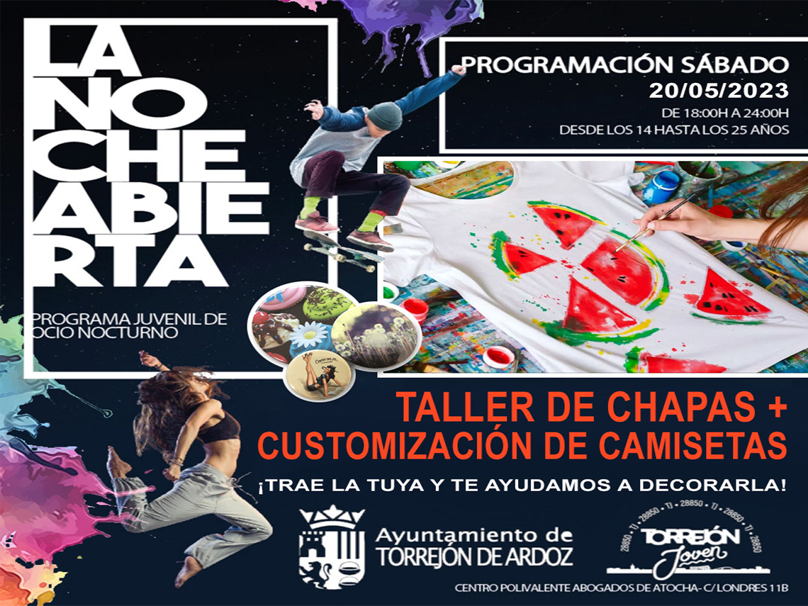 Si quieres decorar alguna de tus camisetas y pasar una divertida tarde en grupo, no te pierdas “La Noche Abierta”, de este sábado, 20 de mayo, donde además habrá un taller de chapas. La cita tendrá lugar a partir de las 18:00 horas en el Centro Polivalente Abogados de Atocha. Además, se podrá disfrutar del resto de actividades que hay de forma habitual, como los juegos de mesa, en colaboración con la Asociación Juvenil Místicos de Arkat, partidas de PS4, futbolín o ping-pong. La entrada es gratuita hasta completar aforo.