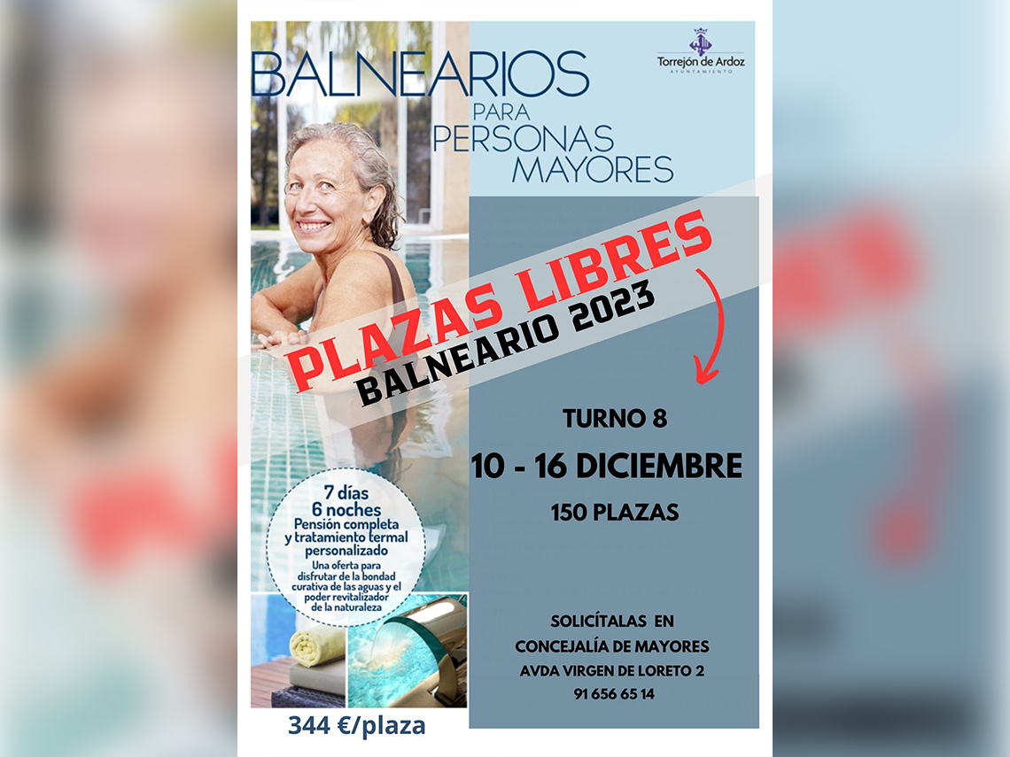 Torrejón de Ardoz, 23 de noviembre de 2023. El Ayuntamiento de Torrejón de Ardoz, a través de la Concejalía de Mayores, vuelve a facilitar tratamientos termales a las personas mayores de 60 años jubiladas o pensionistas, empadronadas en Torrejón de Ardoz. La inscripción permanecerá abierta hasta el próximo 1 de diciembre y para más información, pueden dirigirse a la Concejalía de Mayores, situada en la avenida Virgen de Loreto, 2, o a través del teléfono: 91 656 65 14.