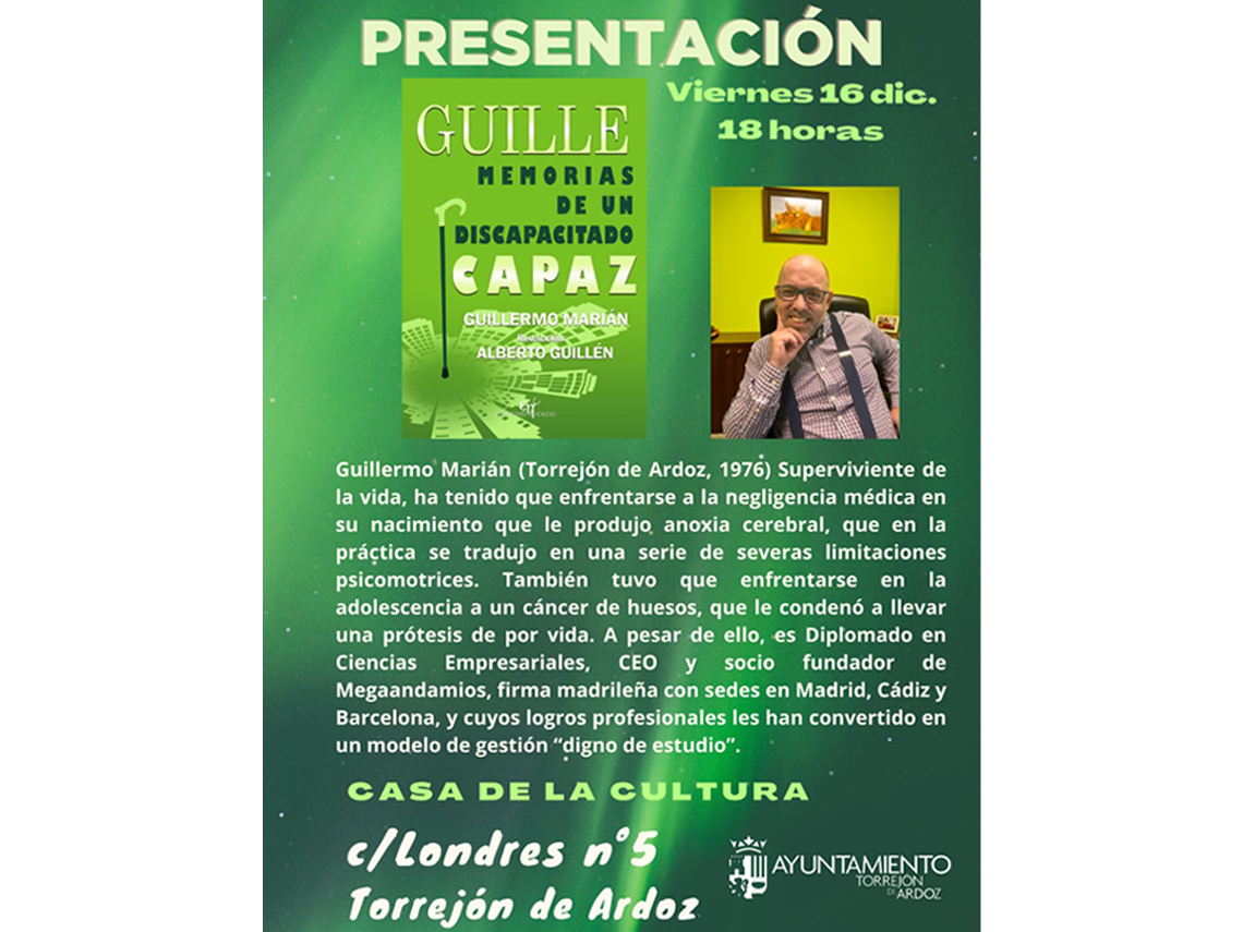 • Además, el pasado viernes 16 de diciembre fue el turno de Guillermo Marián con “Memorias de un discapacitado capaz”, un repaso por la vida de Guille, que no es solo un relato de superación, es un ejercicio diario de perseverancia e inconformismo, de rebeldía vital. Porque este libro habla de capacidad, no de discapacidad
