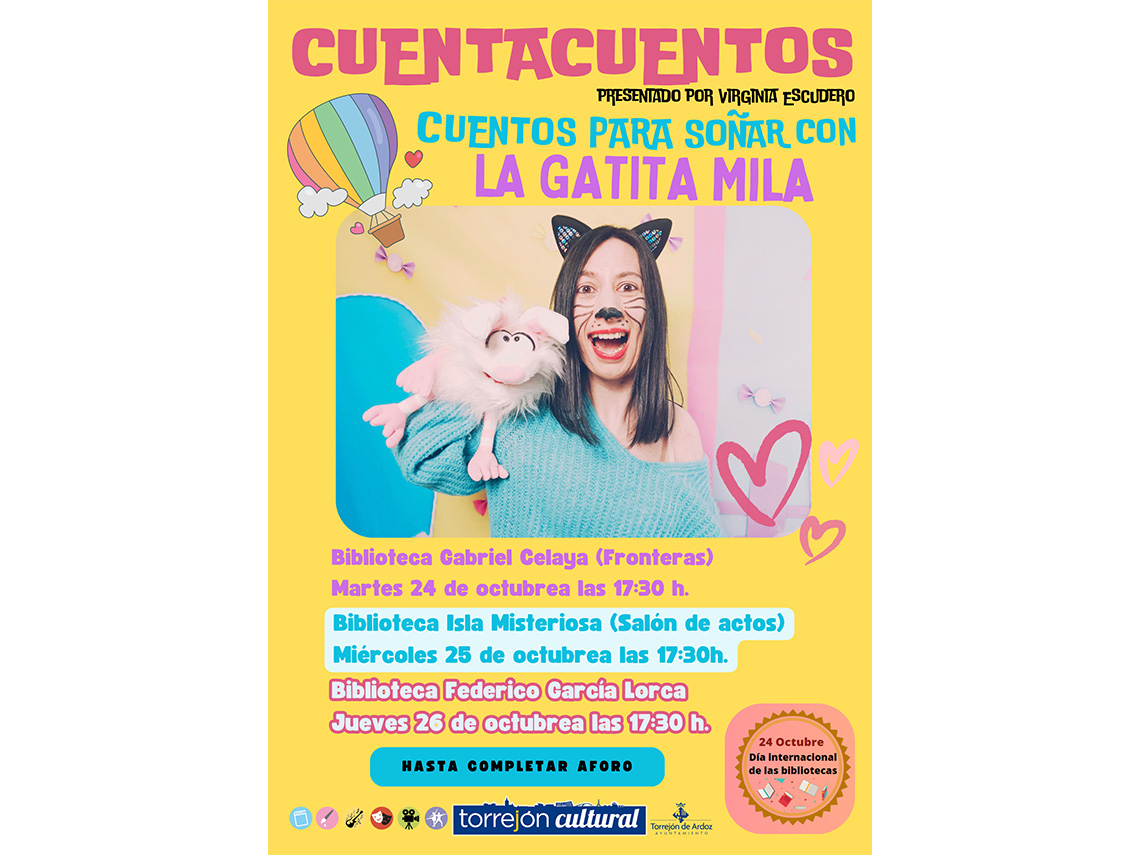 • De esta forma, hoy martes 24 de octubre la Biblioteca Gabriel Celaya (Centro Cultural Las Fronteras) acogerá el cuentacuentos “Cuentos para soñar con la gatita Mila”, presentado por Virginia Escudero, mientras que mañana, 25 de octubre, se representará en la Biblioteca Isla Misteriosa (Centro Cultural Rafael Alberti) y el jueves, 26 de octubre en la Biblioteca Central Federico García Lorca. Todos ellos serán a partir de las 17:30 horas con entrada libre hasta completar aforo