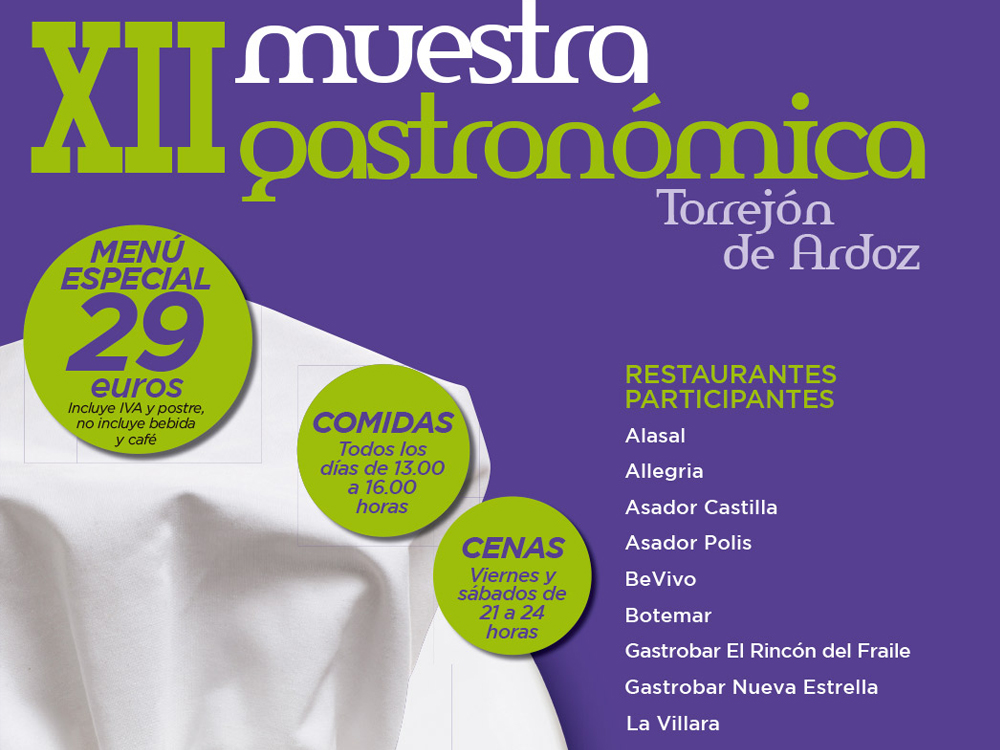 Hasta este domingo, 3 de abril, Torrejón de Ardoz está celebrando la XII Muestra Gastronómica que ofrece menús de alta cocina a 29 euros (con IVA y postre incluidos). En esta edición participan 10 establecimientos hosteleros en los que se pueden degustar menús de una extraordinaria calidad, tanto por la elaboración de los platos como por los alimentos que los componen. Son entrantes, primeros platos, segundos y postres que seguro que estarían en los primeros puestos de cualquier concurso gastronómico.