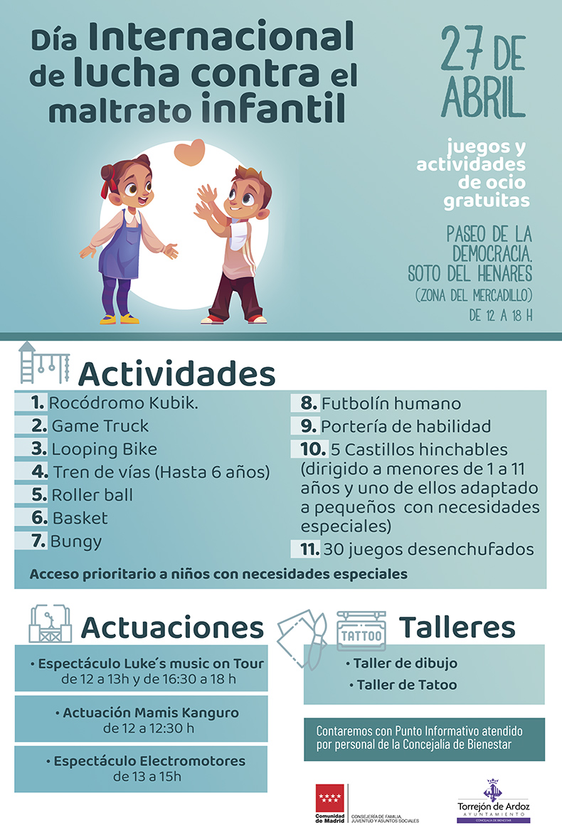 • Con motivo del Día Internacional de Lucha contra el Maltrato Infantil, que tendrá lugar el próximo sábado, 27 de abril, la Concejalía de Bienestar del Ayuntamiento de Torrejón de Ardoz ha organizado una jornada con más de una decena de actividades infantiles, como castillos hinchables (para niños de 1 a 11 años y uno de ellos adaptado a pequeños con necesidades especiales), rocódromo, futbolín humano, game truck, looping bike, roller ball, basket, bungy, tren de vías, portería de habilidad o juegos desenchufados. Además, contará con los espectáculos “Luke’s music on Tour” y “Electromotores”, la actuación de Mamis Kanguro y habrá talleres de dibujo y tatoo