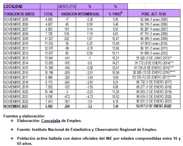 Torrejón de Ardoz registra el quinto mejor dato de creación de empleo en un mes de noviembre desde 2005 con 228 personas desempleadas menos y la menor tasa de paro desde noviembre de 2008 con un 7,29%. Se trata de unos de los mejores datos desde que se contabilizan el número de desempleados.