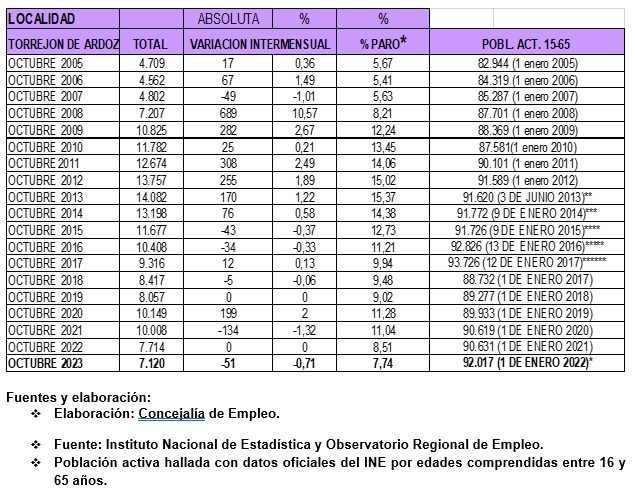 Torrejón de Ardoz registra el segundo mejor dato de creación de empleo en un mes de octubre desde 2005 con 51 personas desempleadas menos y la menor tasa de paro desde 2007 con un 7,74%. Octubre es tradicionalmente un mes en el que se destruye empleo al finalizar muchos contratos estacionales vinculados al consumo estival.
