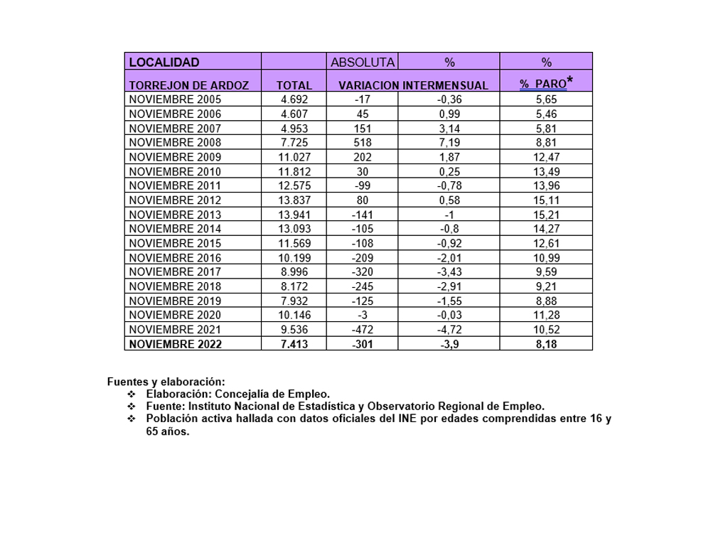 La evolución del desempleo en nuestra ciudad sigue claramente a la baja y Torrejón de Ardoz registra el tercer mejor dato de creación de empleo en un mes de noviembre desde 2005 con 301 personas menos desempleadas y la menor tasa de paro desde hace 15 años con un 8,18%. En noviembre volvió a registrarse una bajada considerable del paro en la ciudad, al reducirse en 301 personas, lo que supone que un total de 2.123 torrejoneros encontraron empleo en el último año.