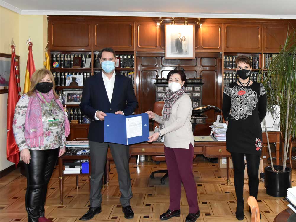 Torrejón de Ardoz, 4 de febrero de 2021. Además, el alcalde, Ignacio Vázquez, ha recibido esta mañana a las representantes de la Asociación Española Contra el Cáncer en Torrejón de Ardoz, Paz Rey, Lola Rentero y M. Carmen Merchán. Asimismo, se ilumina de verde la fachada del Ayuntamiento para mostrar apoyo a pacientes y familiares y concienciar sobre la lucha contra esta enfermedad.