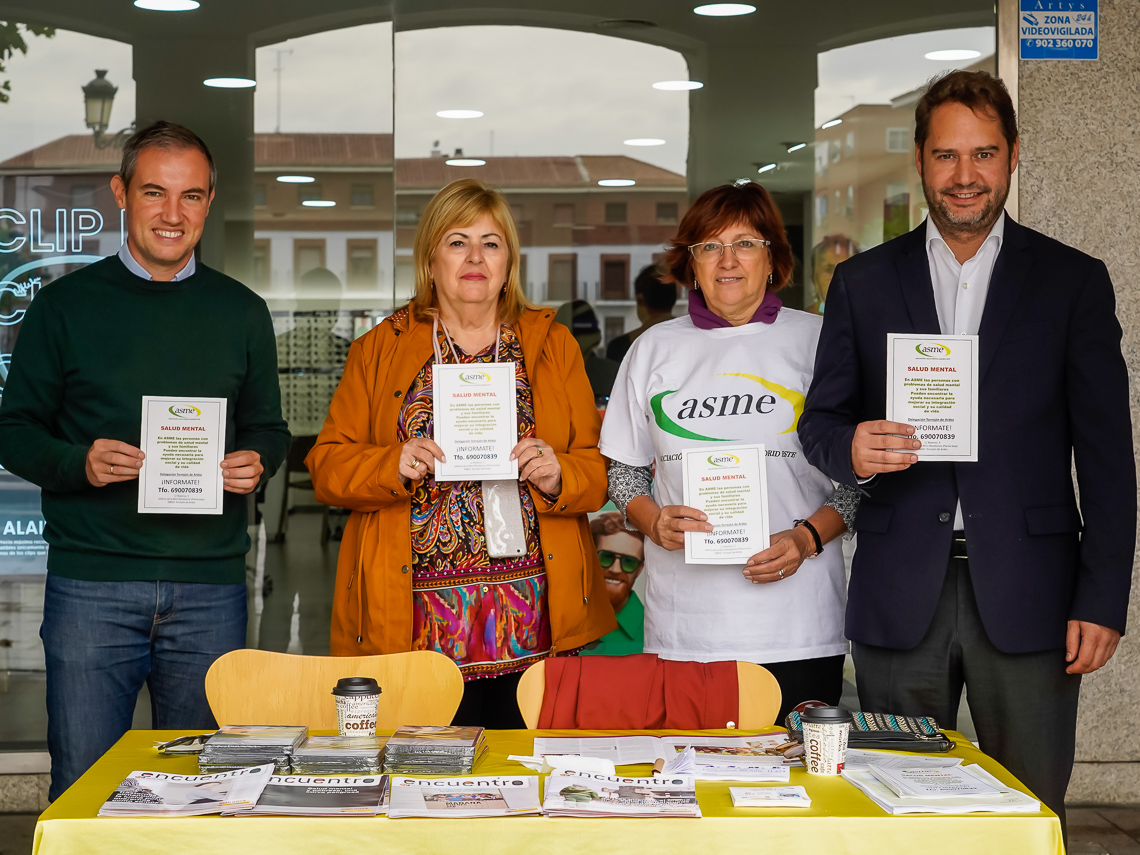 Torrejón de Ardoz se ha sumado a la celebración del Día Mundial de la Salud Mental que está teniendo lugar hoy lunes 10 de octubre. Por ello, la Asociación de Salud Mental Este (ASME) ha colocado una mesa informativa en la Plaza Mayor que ha sido visitada esta mañana por el alcalde, Ignacio Vázquez, y el concejal de Bienestar, Educación e Inmigración, Rubén Martínez, acompañados por su presidenta, Ana Ródenas, con el objetivo de sensibilizar e informar a la población acerca de cuestiones relativas a los diferentes trastornos mentales que existen, así como dar a conocer la labor que esta entidad lleva a cabo en la ciudad.