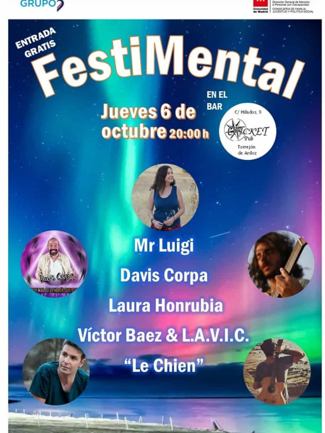 Torrejón de Ardoz, 10 de octubre de 2022. Además, el Centro de Día de soporte social y de Rehabilitación Laboral y Psicosocial de la Red de Atención Social a personas con enfermedad mental grave y duradera de la Comunidad de Madrid, ubicado en la avenida de Madrid 37, gestionado por la entidad Grupo 5, celebró el pasado jueves en la sala Cricket de la calle Hilados 9 “Festimental”, un festival de música abierto para todos los públicos con el objetivo de luchar contra el estigma de la enfermedad mental y que contó con la presencia del concejal de seguridad, Juan José Crespo.